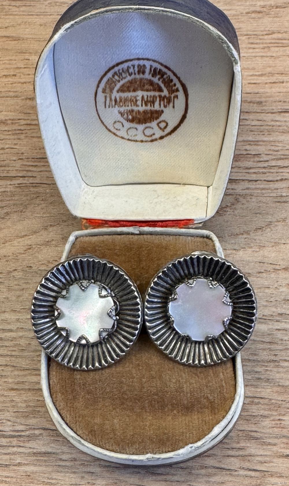 Винтажные клипсы из металла серебристого тона, на лицевой стороне вставка из перламутра. Диаметр клипсы 2,2см. Легкие. Состояние хорошее.