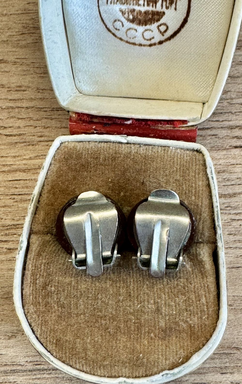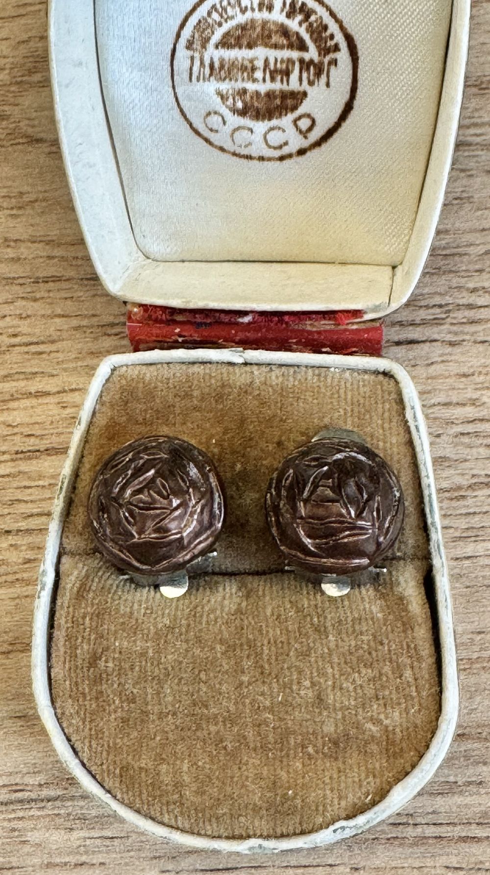 Небольшие винтажные клипсы с основой из металла серебристого тона на лицевой стороне вставки из резного пластика. Диаметр клипсы 1,2см. Состояние хорошее.