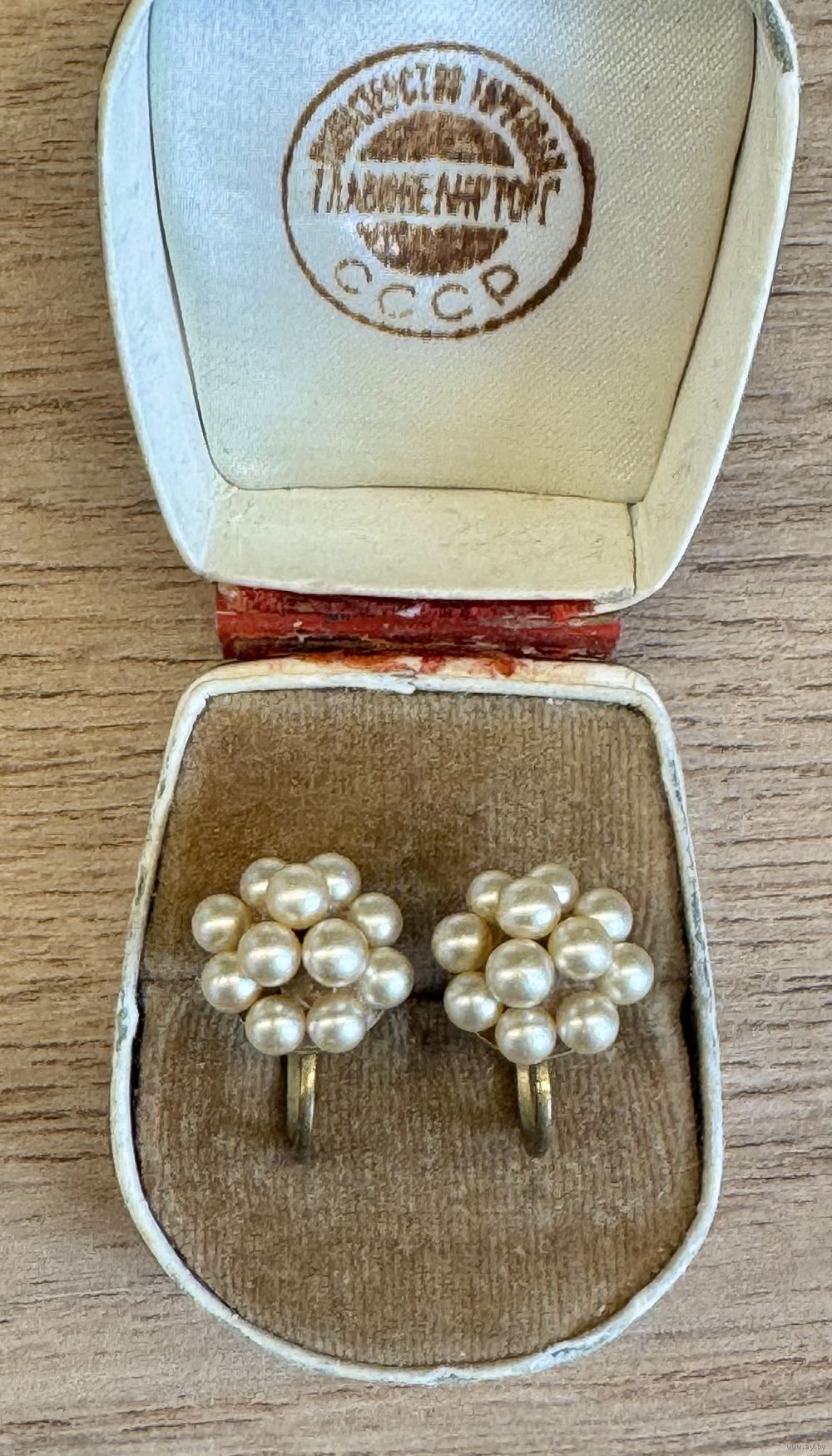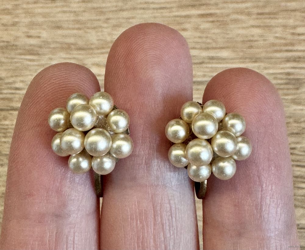 Винтажные наборные клипсы на винтах. Основа из латуни, бусины из стекла с покрытием под жемчуг. Диаметр шляпки 1,3см. Состояние хорошее.