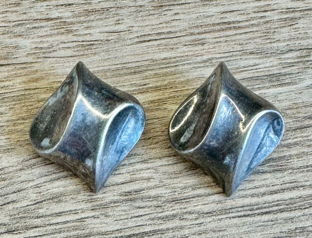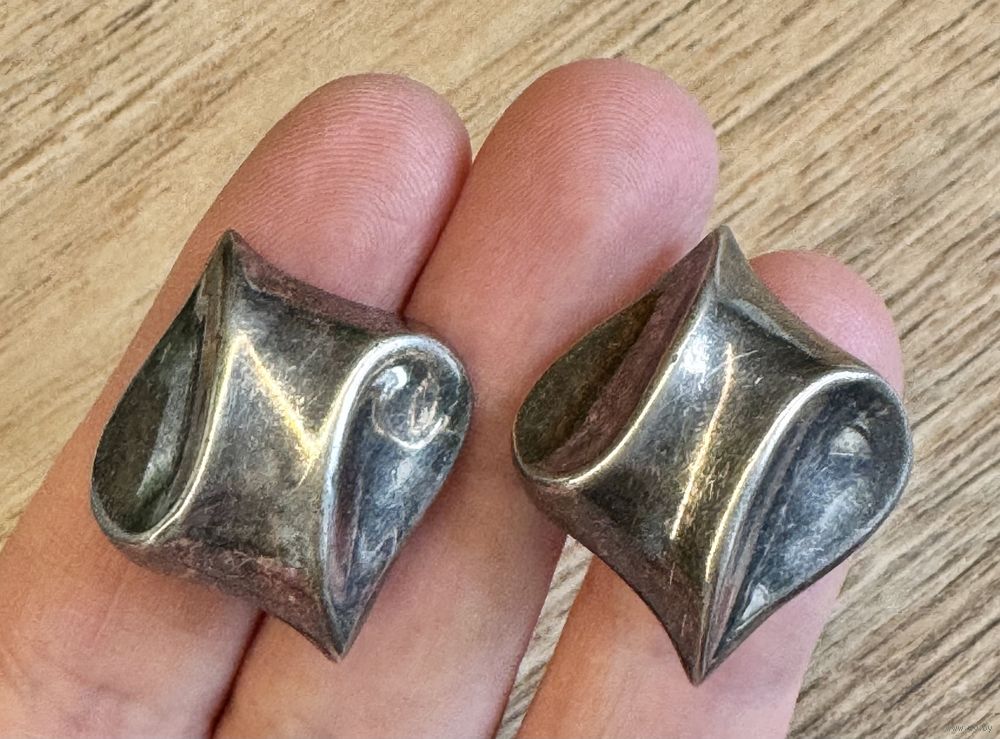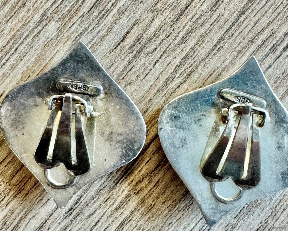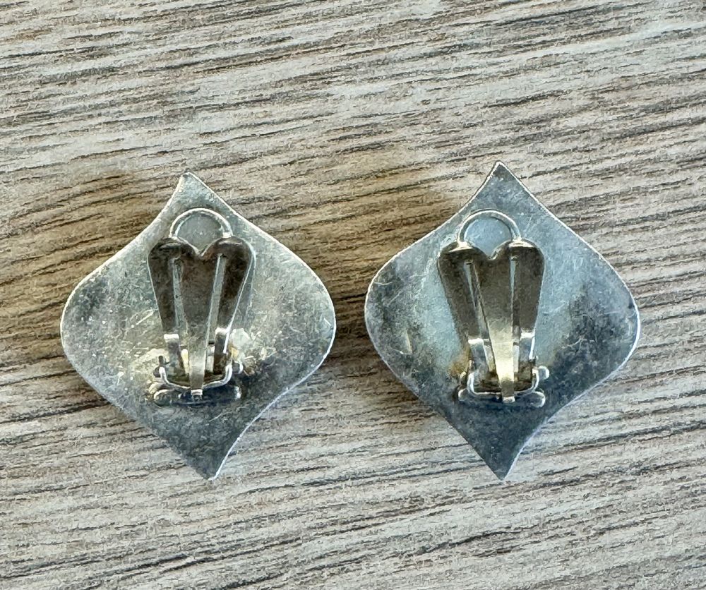 Винтажные клипсы с основой из серебра (на каждой стоит отметка 925), зажимы сделаны из металла (на каждом стоит отметка МЕТ). Размер клипсы 2,8х2,5см., вес пары 9,20гр. Состояние хорошее.