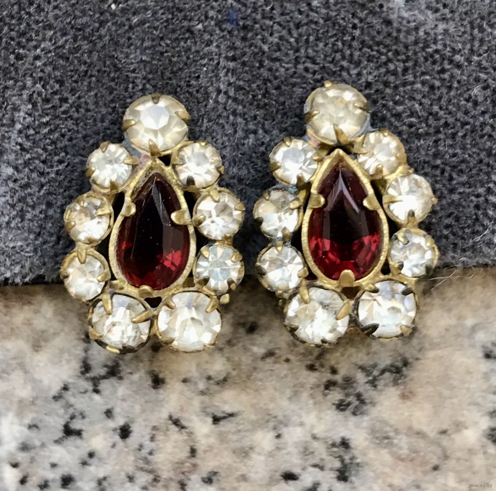 Небольшие винтажные клипсы с основой из латуни и вставками из стекла. Местами есть потемнения позолоты. Высота клипсы 1,5см.