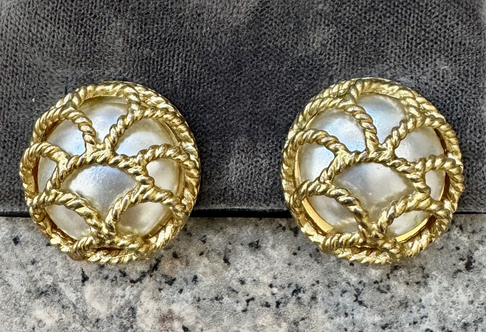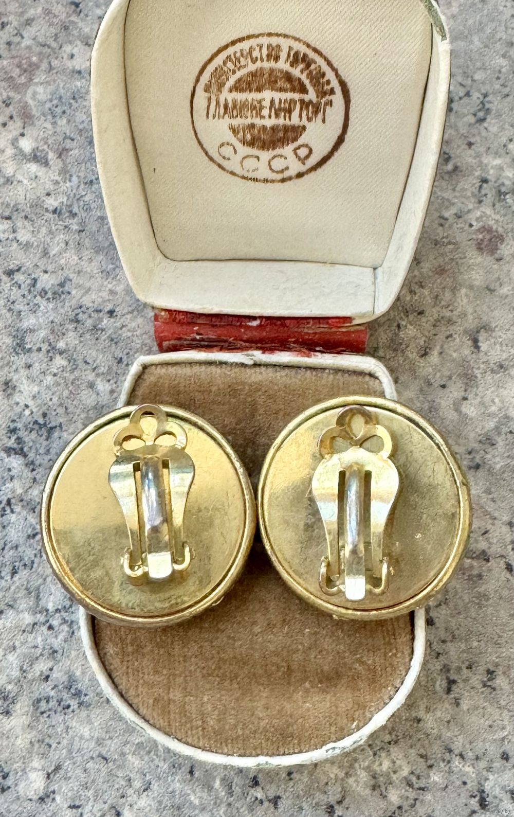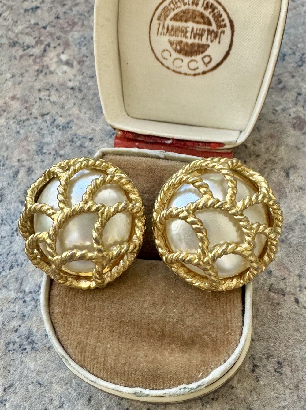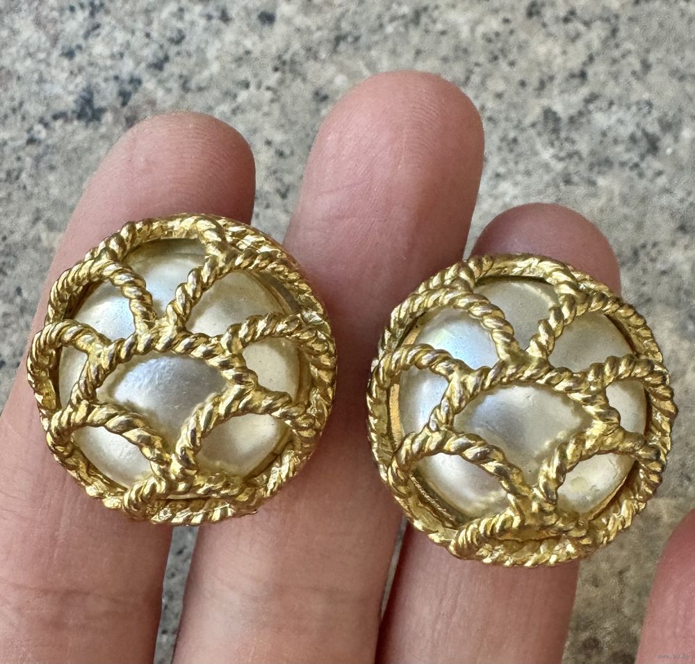 Винтажные клипсы из металла золотого тона, вставка из пластика под жемчуг. Диаметр 2,5см., состояние хорошее.