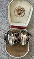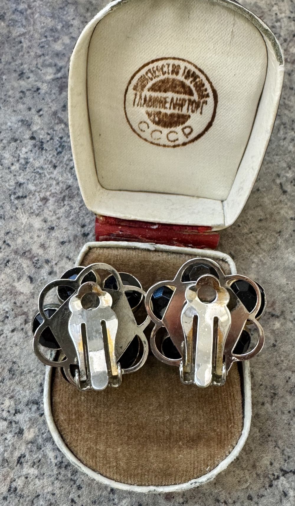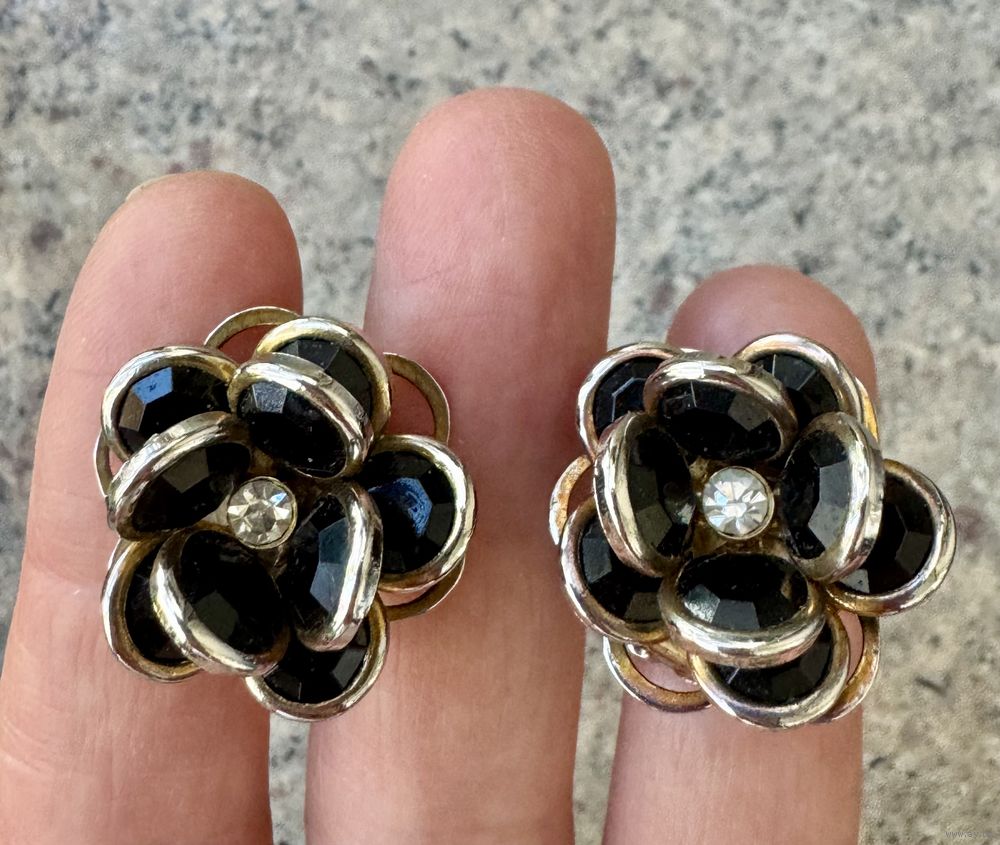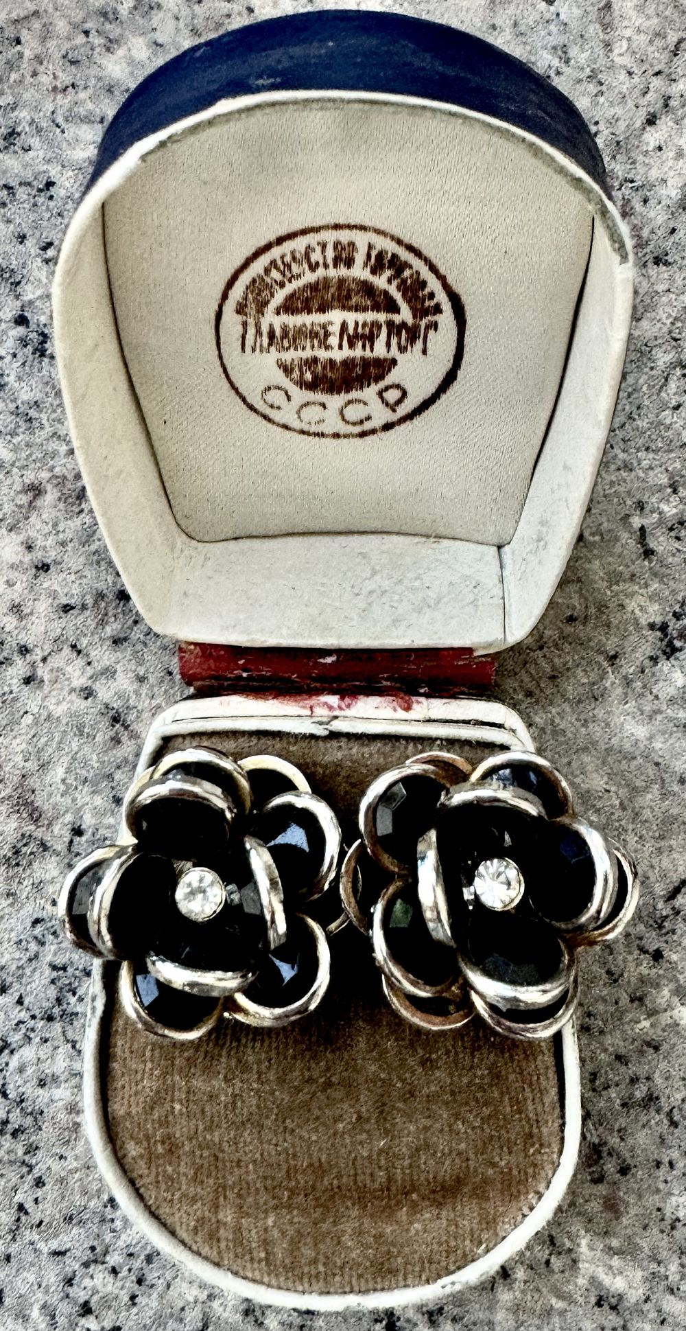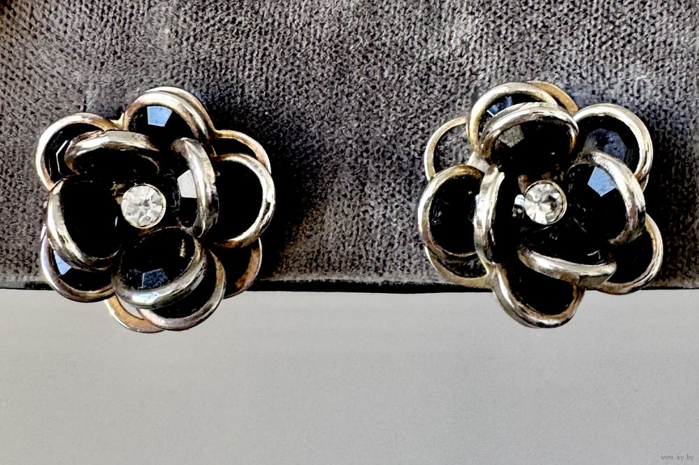 Винтажные клипсы в виде цветка камелии. Основа из металла серебристого тона, лепестки сделаны из чёрного пластика в металлической оправе. Диаметр 2,2см. Состояние хорошее.