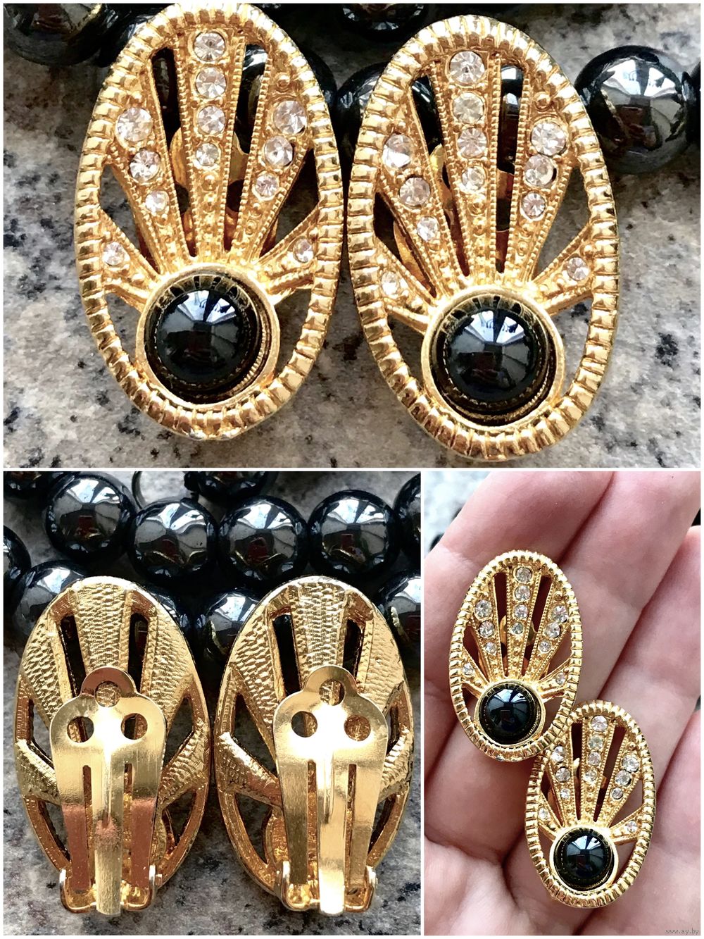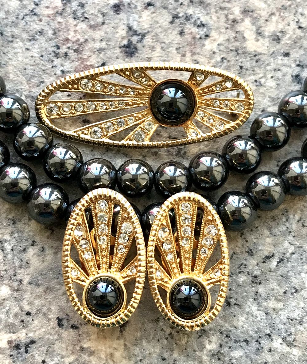 Эффектный винтажный комплект состоящий из броши и клипс, основа выполнена из бижутерного сплава золотого цвета, вставки из стекла чёрного цвета и кристаллов. Высота клипсы 3см., ширина 1,7см. Замок держит надёжно. Брошь 5х2см. Состояние хорошее.