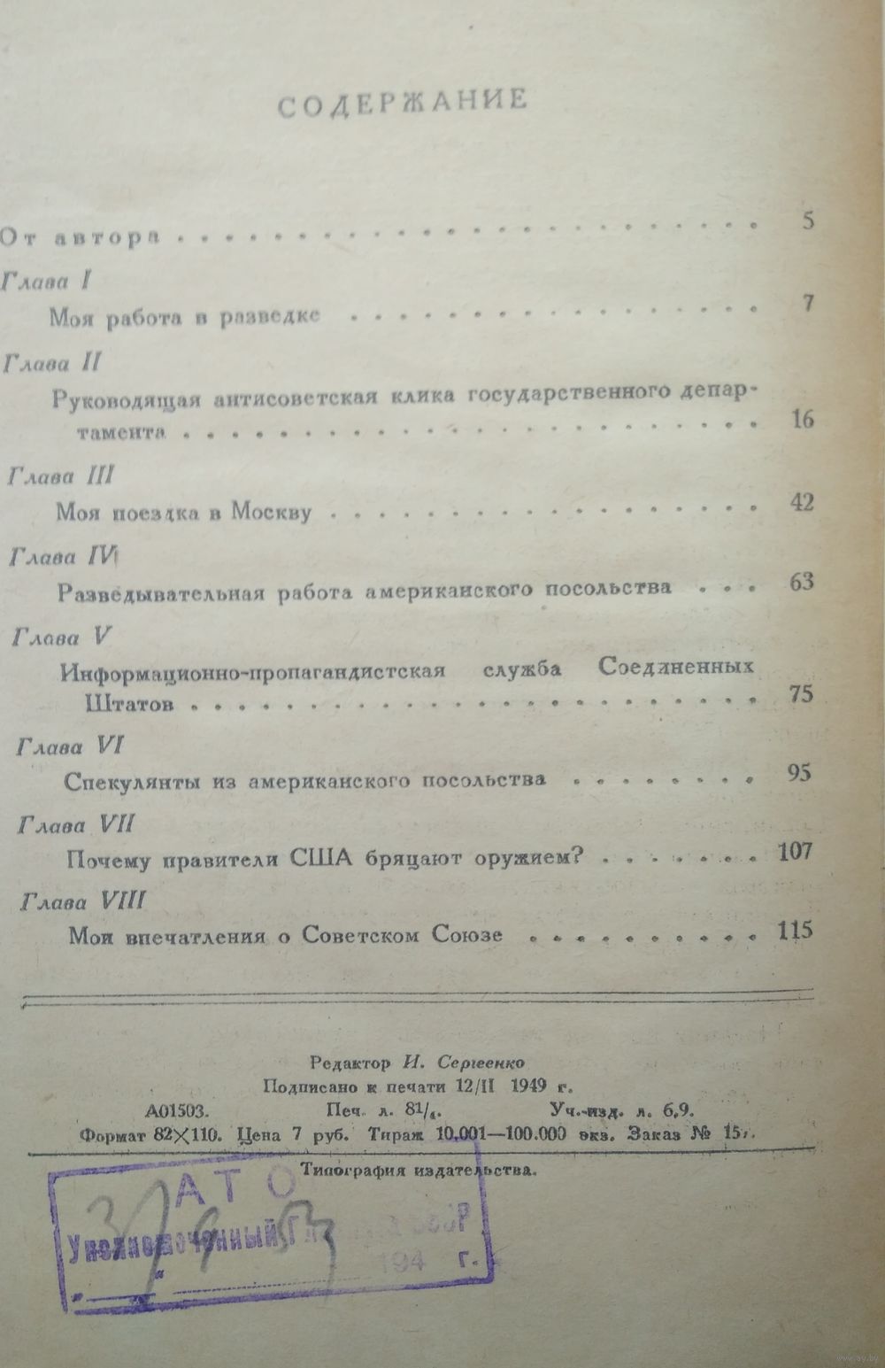 От автора: `… книга является результатом моего длительного общения с людьми, от которых американский народ ожидал, что они будут поддерживать и развивать добрососедские отношения со всеми странами, в том числе и с Советским Союзом, оказавшим неоценимую услугу человечеству в деле борьбы со смертельной опасностью со стороны фашизма. Однако то, что я видела в госдепартаменте и в посольстве США в Москве, находилось в вопиющем противоречии с этими ожиданиями американского народа. Я видела, как заносится дамоклов меч над человечеством и как этот меч, опускаясь все ниже и ниже, грозит снова затопить в крови миллионы людей. Поэтому я не могу молчать!` содержание. 1. Моя работа в разведке. 2. Руководящая антисоветская клика государственного департамента. 3. Моя поездка в Москву. 4. Разведывательная работа американского посольства. 5. информационно-пропагандистская служба Соединенных Штатов. Спекулянты из американского посольства. 7. Почему правители США бряцают оружием? 8. Мои впечатления о Советском Союзе.