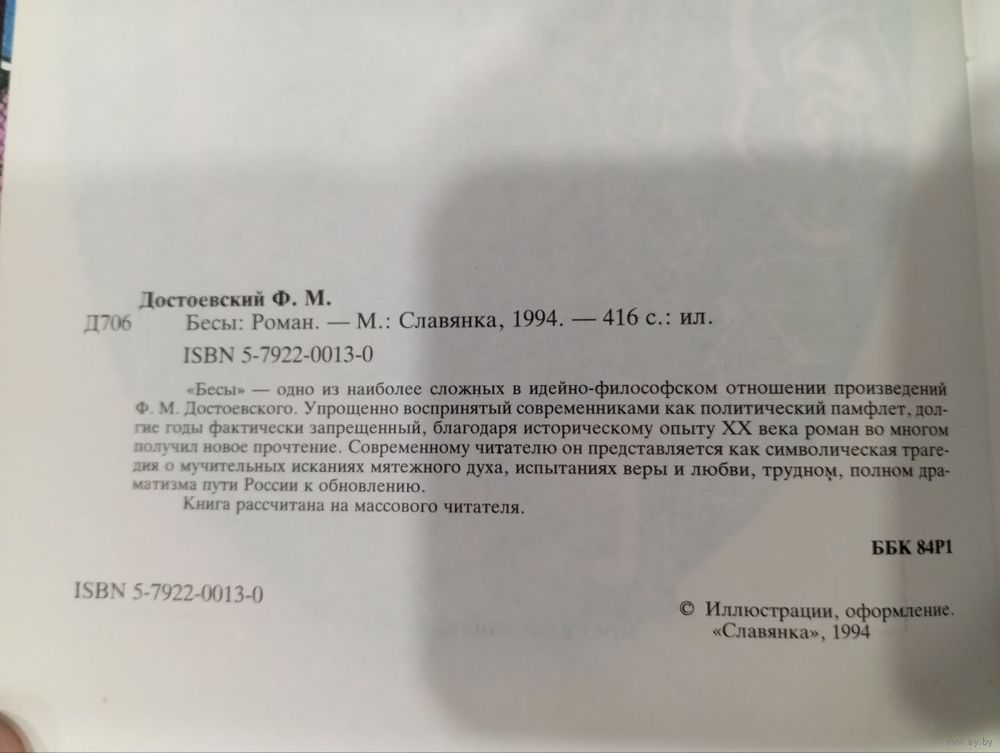 Продаю книгу Ф.М. Достоевского "Бесы". Это издание 1994 года от издательства "Славянка" отличается глубоким философским осмыслением романа. В аннотации подчеркивается, что это произведение — символическая трагедия о мятежном духе и пути России к обновлению, что делает его особенно ценным для вдумчивого читателя.