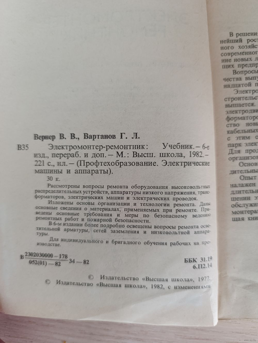 Книга. В. В. Вернер, Г. Л. Вартанов. " Электромонтер - Ремонтник ". Книга в хорошем состоянии все страницы целые не порвоные.
