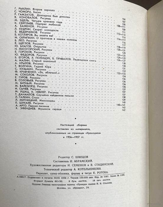 Книга "Ежегодник Крокодила". 1958 г. Первый выпуск. Издательство "Правда". Составитель: Абрамский Илья Павлович. 144 стр. Сбoрник cоcтавлeн из матepиaлoв, oпубликoвaнных на страницaх "Kpoкoдилa" в 1956-1957 гг. В издательском картонажном переплете. Состояние хорошее. Присутствуют следы времени.