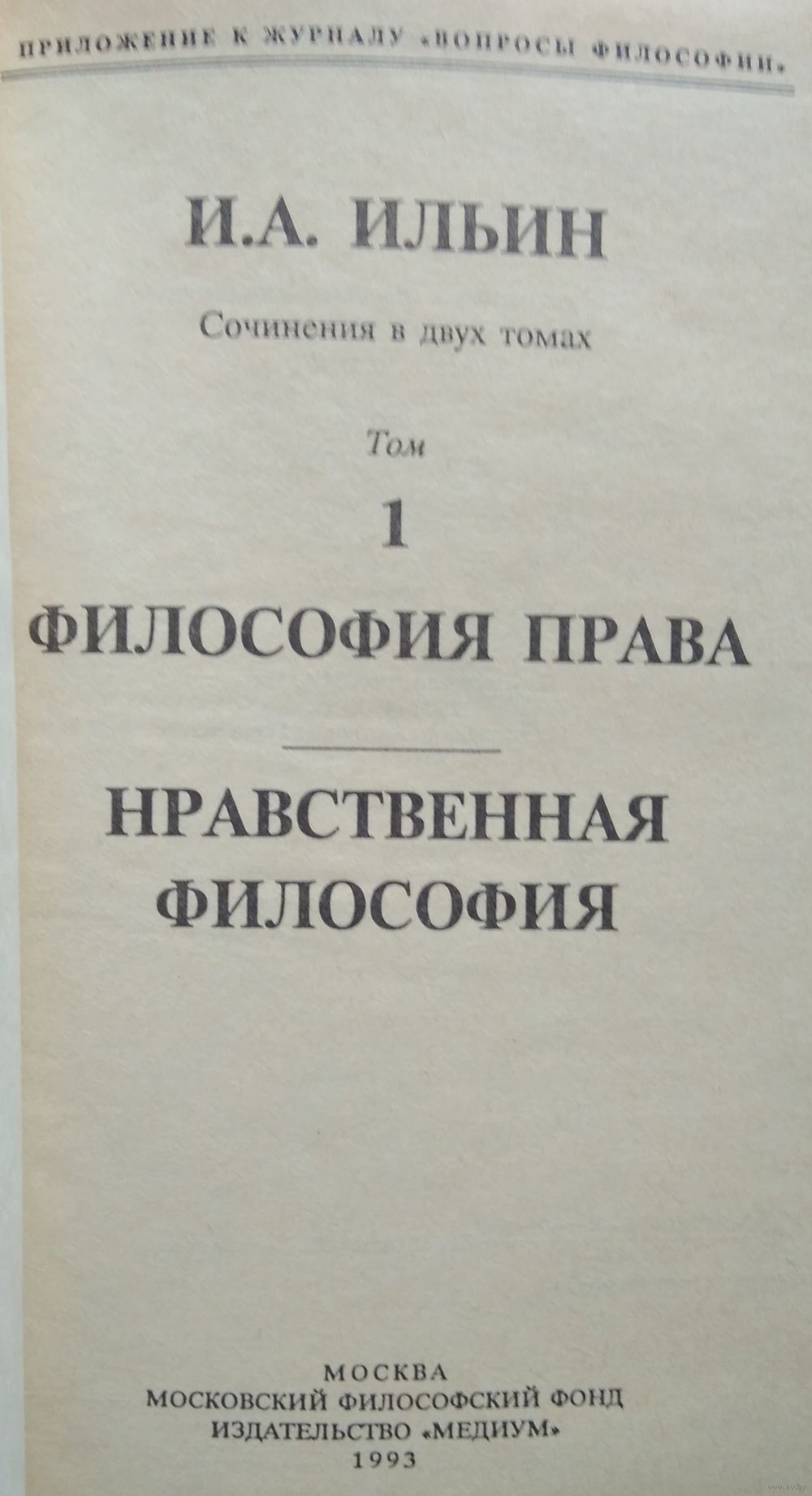 Ильин Иван Александрович (1883-1954) - правовед и религиозный философ, автор глубоких историко-философских сочинений, трудов по философии права, нравственной философии, философии религии, эстетике. В 1906 г. окончил юридический факультет Московского университета с дипломом первой степени. В 1910 - 1912 жил за границей, где продолжал свою научную деятельность в университетах Европы, занимался в семинарах Г. Риккерта, Г. Зиммеля, Э. Гуссерля, собирал материалы и готовил диссертацию. После возвращения в Россию преподавал в Московском университете. В 1918 г. защитил диссертацию ``Философия Гегеля как учение о конкретности Бога и человека``, за которую сразу получил две степени - магистра и доктора наук. После 1917 г. неоднократно арестовывался и в 1922 г. вместе с женой был выслан в Германию. В Берлине принял участие в создании центра русской культуры. Был одним из организаторов, профессором и деканом Русского Научного института. Издавал журнал ``Русский колокол``, читал лекции по русской культуре, был идеологом Белого движения.