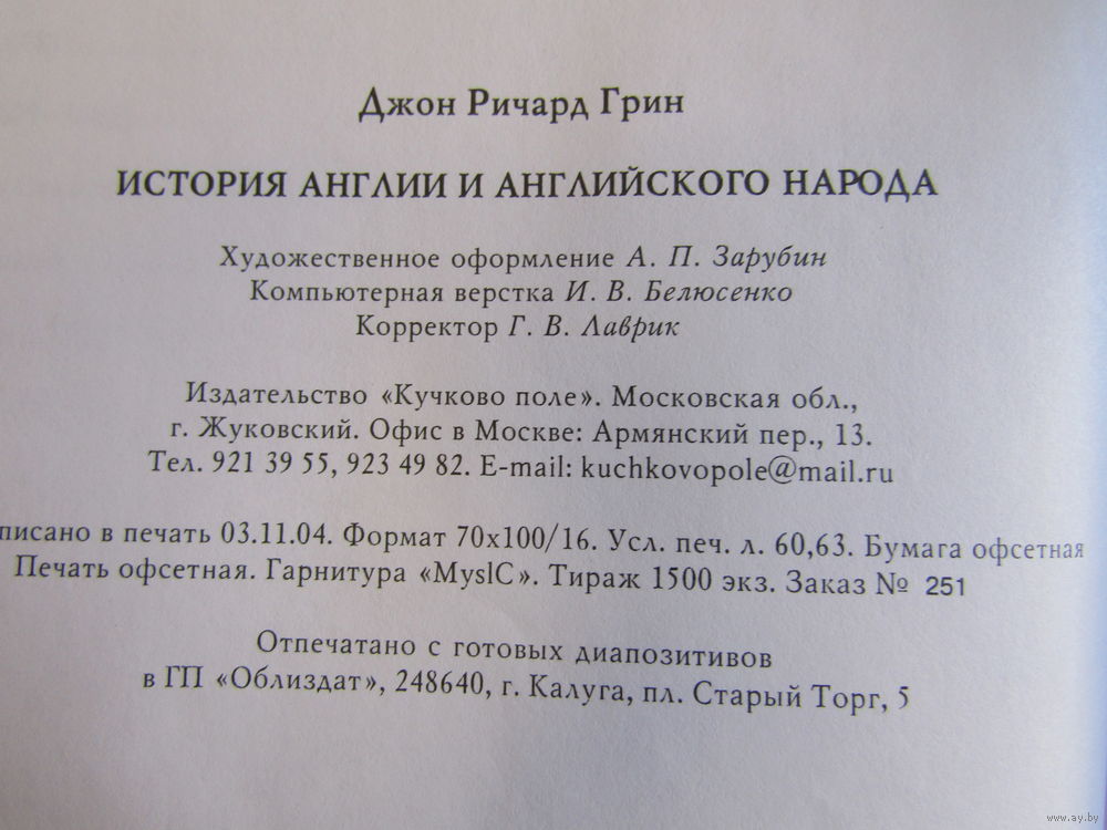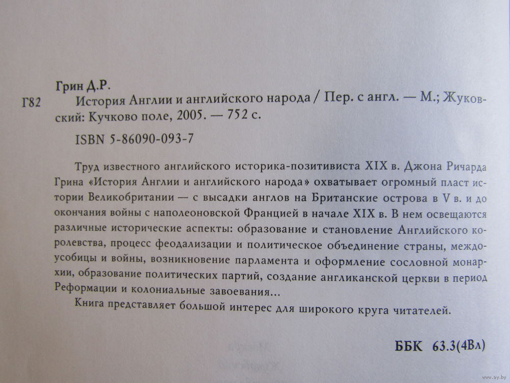 Большой энциклопедический формат. Тираж 1500 экз. 752 стр. Фундаментальный академический труд Джона Ричарда Грина «История Англии и английского народа» охватывает огромный пласт истории Великобритании – с высадки англов на Британские острова в V в. и до
