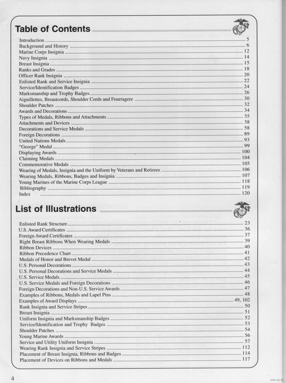 В книге описаны знаки различия, нашивки, медали, квалификационные знаки морской пехоты США от Второй мировой войны до 2000г.