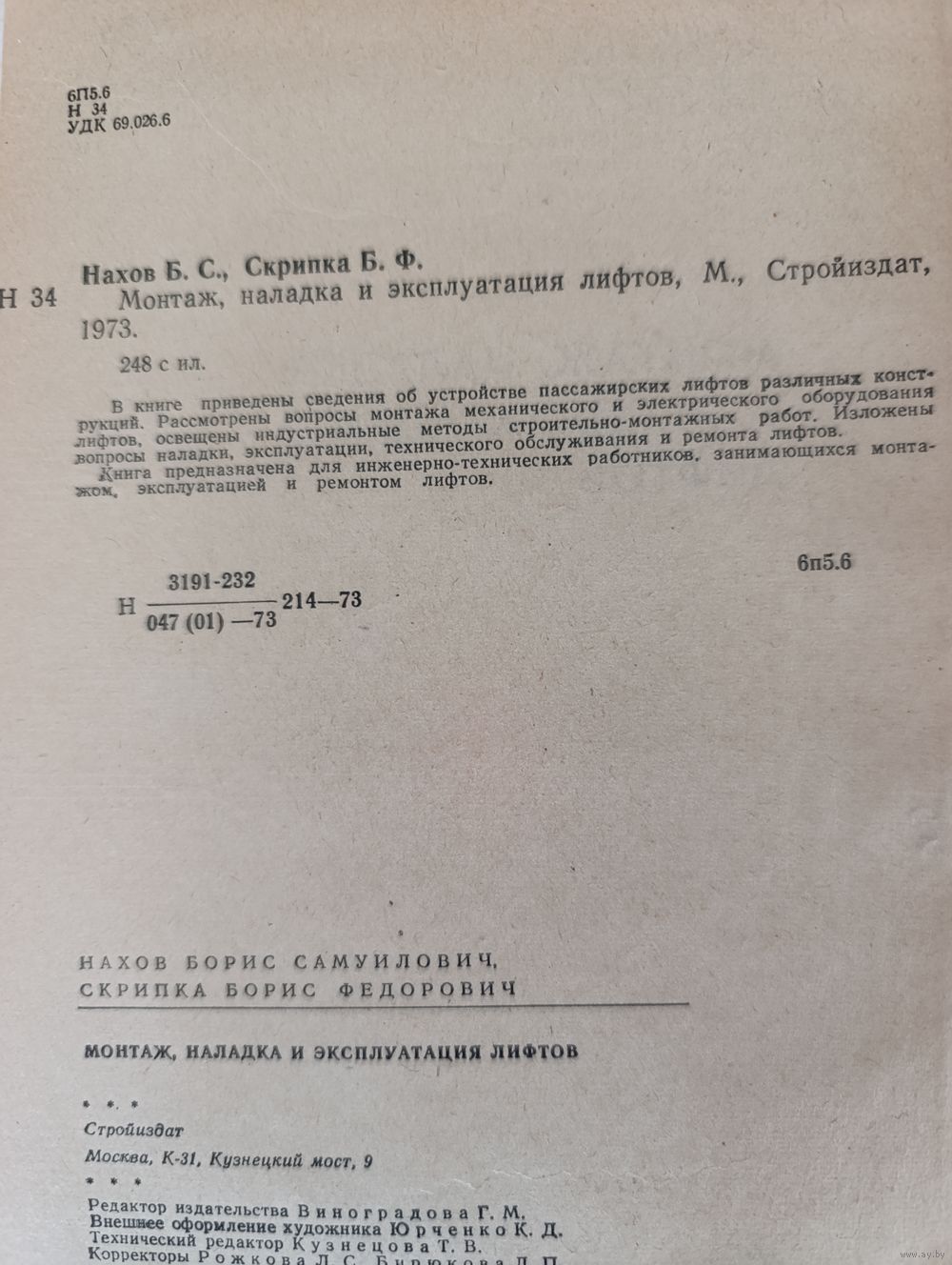 Книга. Б. С. Нахов, Б. Ф. Скрипка. " Монтаж, наладка и эксплуатация лифтов ". Книга в среднем состояние на фото (3),(6) видно.