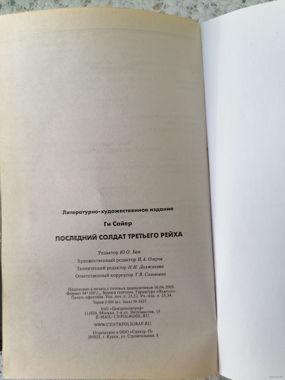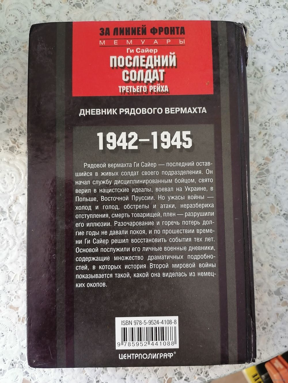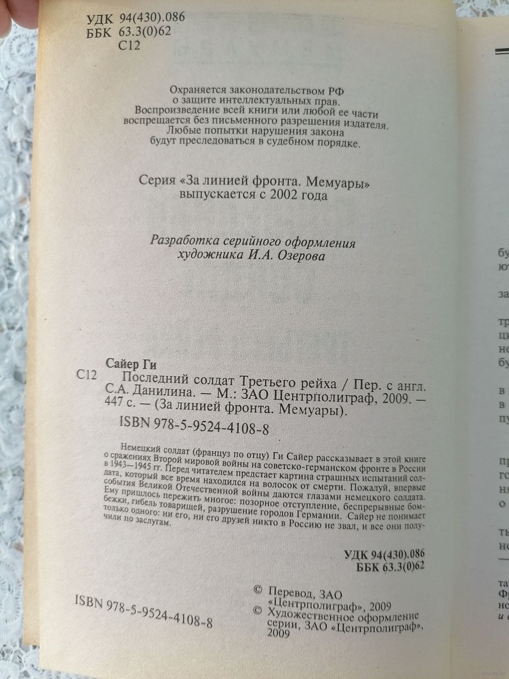 Книга,, Последний солдат третьего рейха "Великая Отечественная 1941-1945г.Издана 2009г.Состояние на фото, есть надпись на внутренней стороне, есть на переплёте надрыв, в целом состояние неплохое, все страницы, иллюстрации нету. Оплата на карту или при передачи лично, любая почта, высылаю быстро.