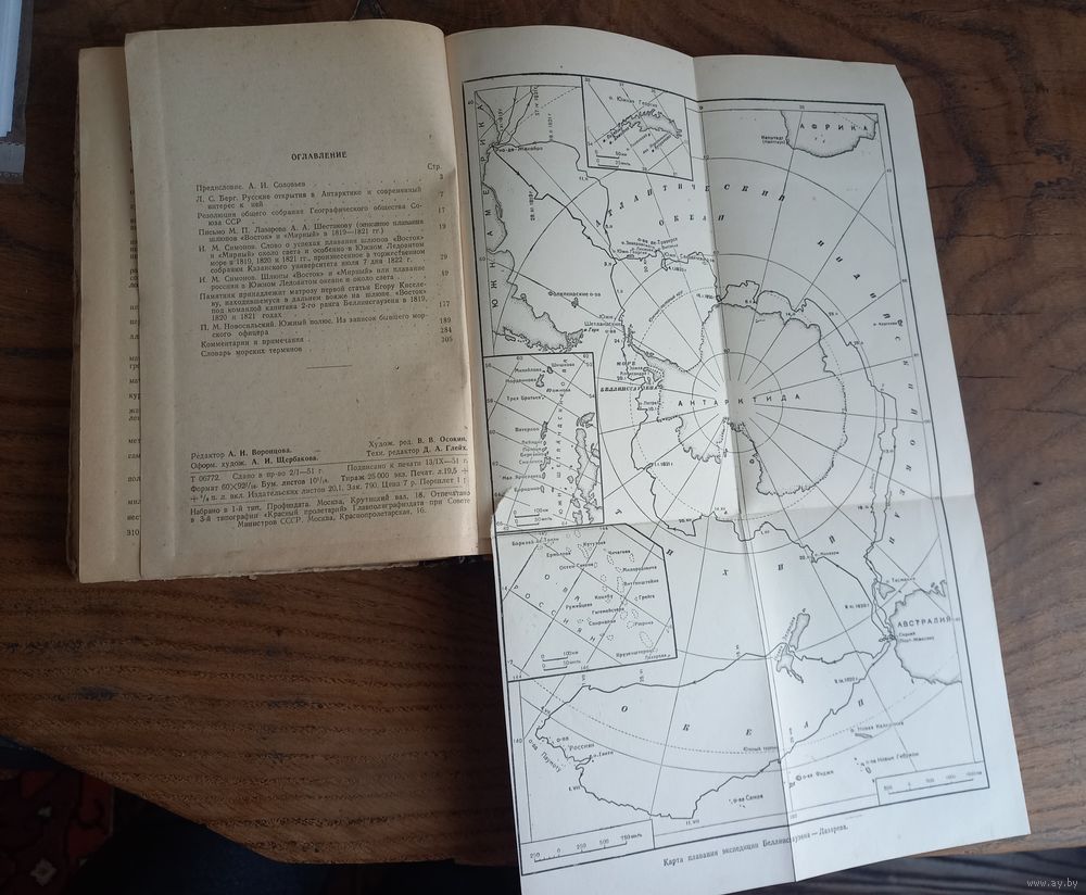 Книга "Русские открытия в Антарктике" 1951г. Государственное издательство географической литературы (Географгиз), Москва, тираж 25 000 экземпляров, с картой.