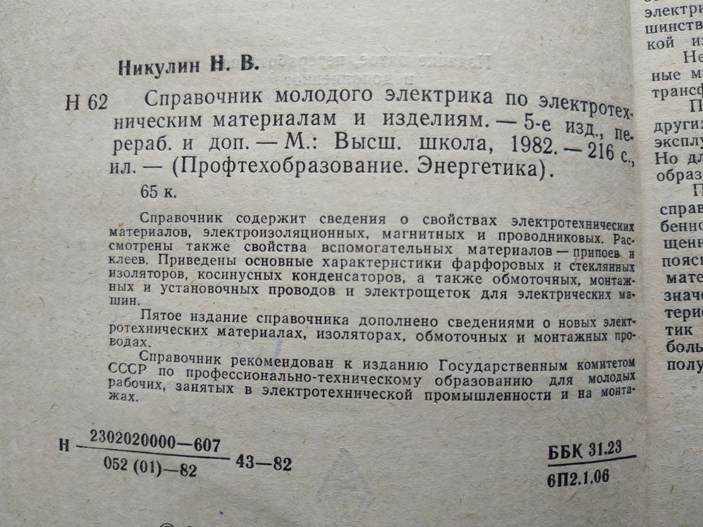 Книга "Справочник молодого электрика по электротехническим материалам и изделиям". СССР, 1982 год.