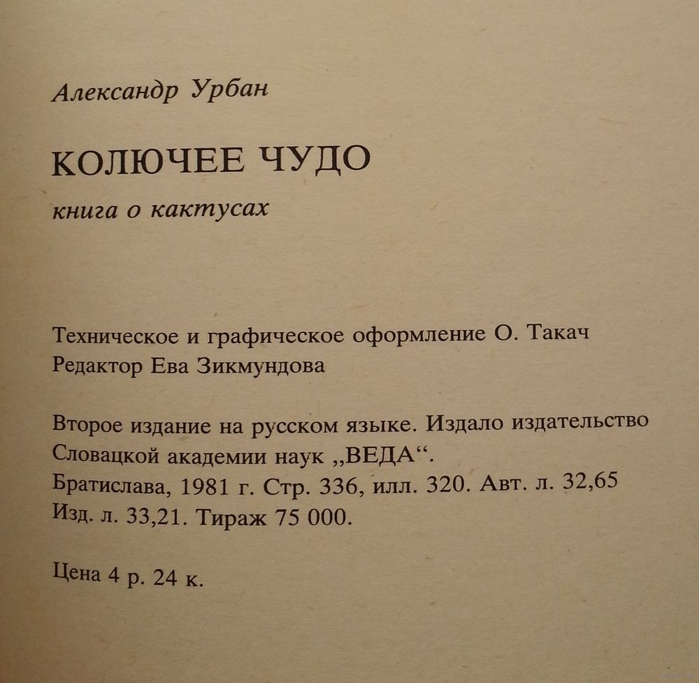 `Колючее чудо` - книга словацкого автора о кактусах. В ней он делится с читателями своим многолетним опытом культивирования этих растений, знакомит с краткой историей развития увлечения кактусами. В последней главе дается подробная систематика родов и видов кактусов на основе новейших исследований ботаников. Содержание: Колючки и иллюзии: I. О кактусах и кактусистах, Увлечение кактусами, Культурные растения, Из истории коллекционирования кактусов. Суккулентность, Кактусы в природе, Кактусы в коллекциях. II. Культивирование кактусов: Не вредить!, Культивирование кактусов в квартире, Переносные теплички, Теплица, Культура кактусов под открытым небом, Парники, Пересадка кактусов, Земля для кактусов, Хемокультура, Цветочные горшки и жестянки, Свет, Теплота, Вода, Питательные вещества. III. Размножение кактусов: Утро в теплице, Вегетативное размножение кактусов, Прививка кактусов, Время прививки, Выбор подвоя, Техника прививки, Цветы, плоды, семена, Посев кактусов, Болезни и вредители. IV. Роды и виды кактусов: Системная классификация кактусов,I. Peireskioideae, II. Opuntioideae, III. Cereoideae, Ботанические названия кактусов, Выбор видов для культивирования, Южноамериканские шаровидные и низкие кактусы, Североамериканские шаровидные и низкие кактусы, Столбовидные кактусы, Остальные кактусы, пригодные для культивирования, Эпифитные кактусы. Десять заповедей кактусиста. Литература. Указатель названий кактусов. (Фотографии на мелованной бумаге.)