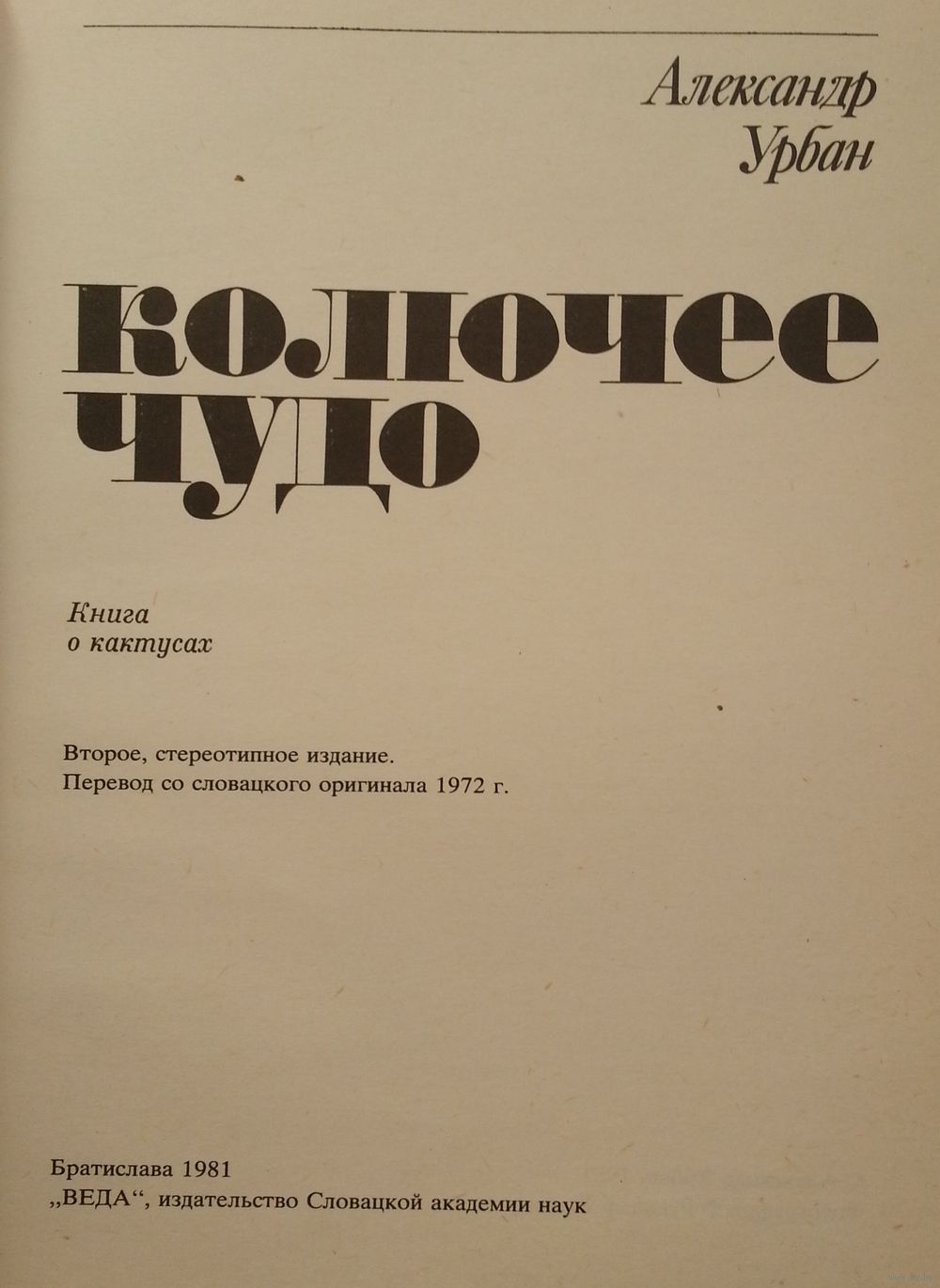 `Колючее чудо` - книга словацкого автора о кактусах. В ней он делится с читателями своим многолетним опытом культивирования этих растений, знакомит с краткой историей развития увлечения кактусами. В последней главе дается подробная систематика родов и видов кактусов на основе новейших исследований ботаников. Содержание: Колючки и иллюзии: I. О кактусах и кактусистах, Увлечение кактусами, Культурные растения, Из истории коллекционирования кактусов. Суккулентность, Кактусы в природе, Кактусы в коллекциях. II. Культивирование кактусов: Не вредить!, Культивирование кактусов в квартире, Переносные теплички, Теплица, Культура кактусов под открытым небом, Парники, Пересадка кактусов, Земля для кактусов, Хемокультура, Цветочные горшки и жестянки, Свет, Теплота, Вода, Питательные вещества. III. Размножение кактусов: Утро в теплице, Вегетативное размножение кактусов, Прививка кактусов, Время прививки, Выбор подвоя, Техника прививки, Цветы, плоды, семена, Посев кактусов, Болезни и вредители. IV. Роды и виды кактусов: Системная классификация кактусов,I. Peireskioideae, II. Opuntioideae, III. Cereoideae, Ботанические названия кактусов, Выбор видов для культивирования, Южноамериканские шаровидные и низкие кактусы, Североамериканские шаровидные и низкие кактусы, Столбовидные кактусы, Остальные кактусы, пригодные для культивирования, Эпифитные кактусы. Десять заповедей кактусиста. Литература. Указатель названий кактусов. (Фотографии на мелованной бумаге.)