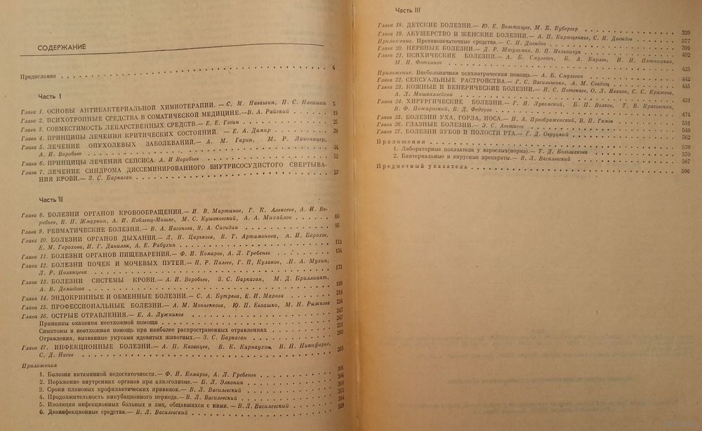В 4-м издании справочника описаны основные клинические проявления, диагностические признаки, этиология и патогенез, принципы лечения заболеваний, с которыми постоянно встречаются практические врачи. Представлены болезни органов кровообращения, дыхания, пищеварения, ревматические болезни, болезни почек и мочевых путей, системы крови, эндокринные и обменные болезни, профессиональные болезни, острые отравления, инфекционные болезни. Вводная часть содержит принципы антибактериальной терапии, лечения шока и терминальных состояний, сепсиса и опухолей, описание применяемых в лечебной практике психотропных средств. Для врачей всех специальностей.