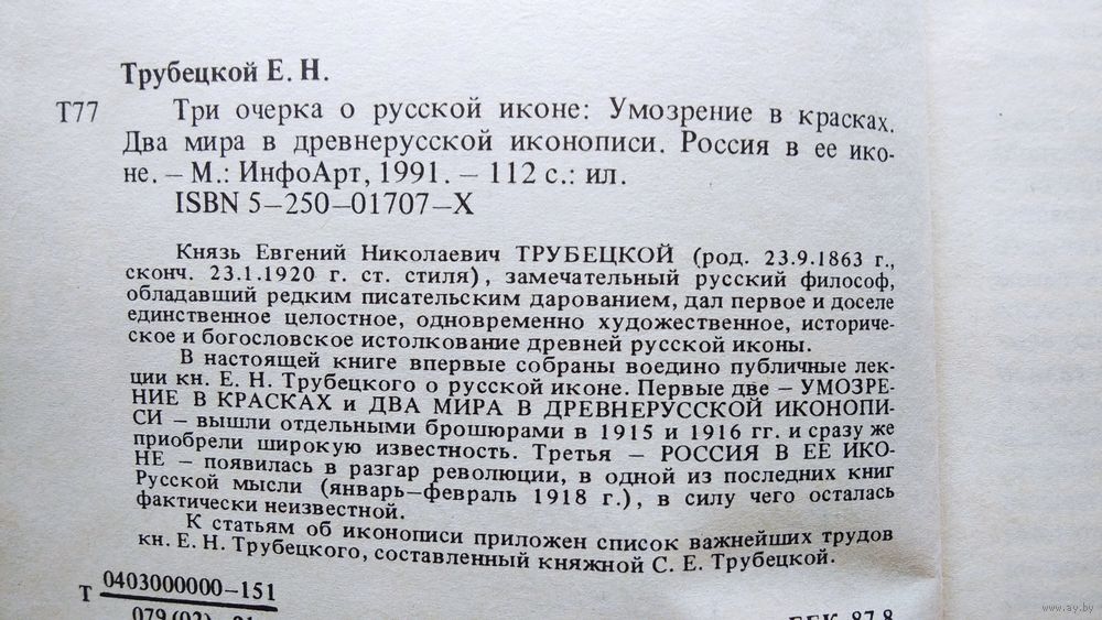 Князь Е. Н. Трубецкой (1863-1920), замечательный русский философ, обладавший редким писательским дарованием, дал первое и единственное целостное, одновременно художественное, историческое и богословское истолкование древней русской иконы. В книге собраны воедино публичные лекции кн. Е. Н. Трубецкого о русской иконе. Первые две — Умозрение в красках и Два мира в древне — русской иконописи — вышли отдельными брошюрами в 1915 и 1916 гг. и сразу приобрели широкую известность, но ни разу не переиздавались и стали библиографическими редкостями. Третья — Россия в ее иконе — появилась в разгар революции, в одной из последних книг Русской Мысли (январь — февраль 1918 г.), в силу чего осталась фактически неизвестной.