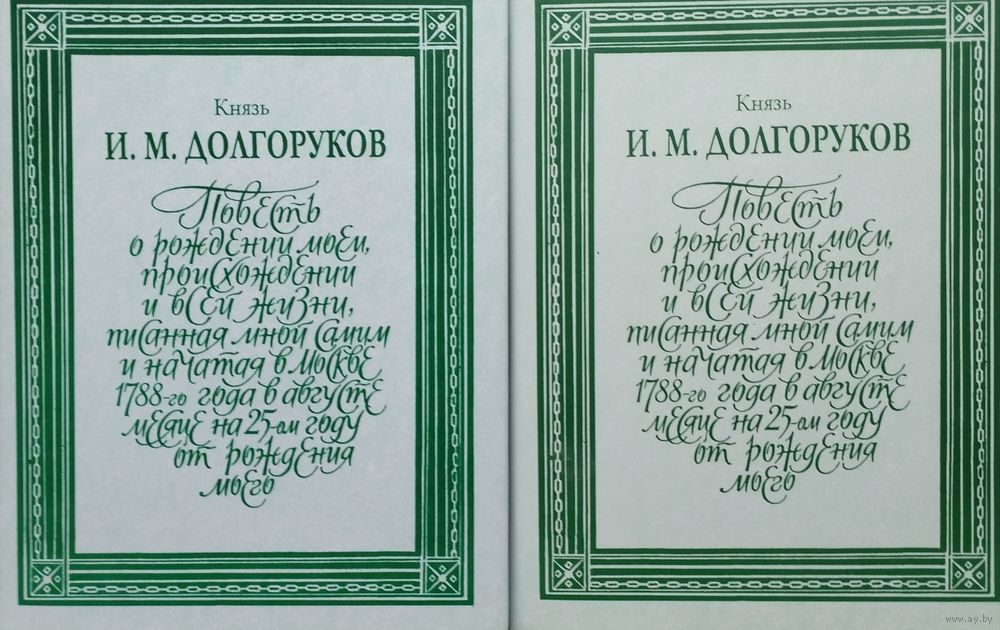 Цена за 2 тома. Большой формат. Тираж 2000 экз. 814+860 стр. Князь И. М. Долгоруков. Повесть о рождении моем, происхождении и всей жизни, писанная мной самим и начатая в Москве 1788-го года в августе месяце, на 25-ом году от рождения моего. В книгу сию включены будут все достопамятные происшествия, случившиеся уже со мною до сего года и впредь имеющие случиться. Здесь же впишутся копии с примечательных бумаг, кои будут иметь личную со мною связь и к собственной истории моей уважительное отношение. Первая полная научная публикация мемуаров известного в свое время поэта и государственного деятеля князя Ивана Михайловича Долгорукова (1764—1823), живо рисующих быт и нравы аристократического общества России второй половины XVIII и начала XIX столетия. Другое мемуарное произведение Долгорукова («Капище моего сердца») издано в серии ранее.