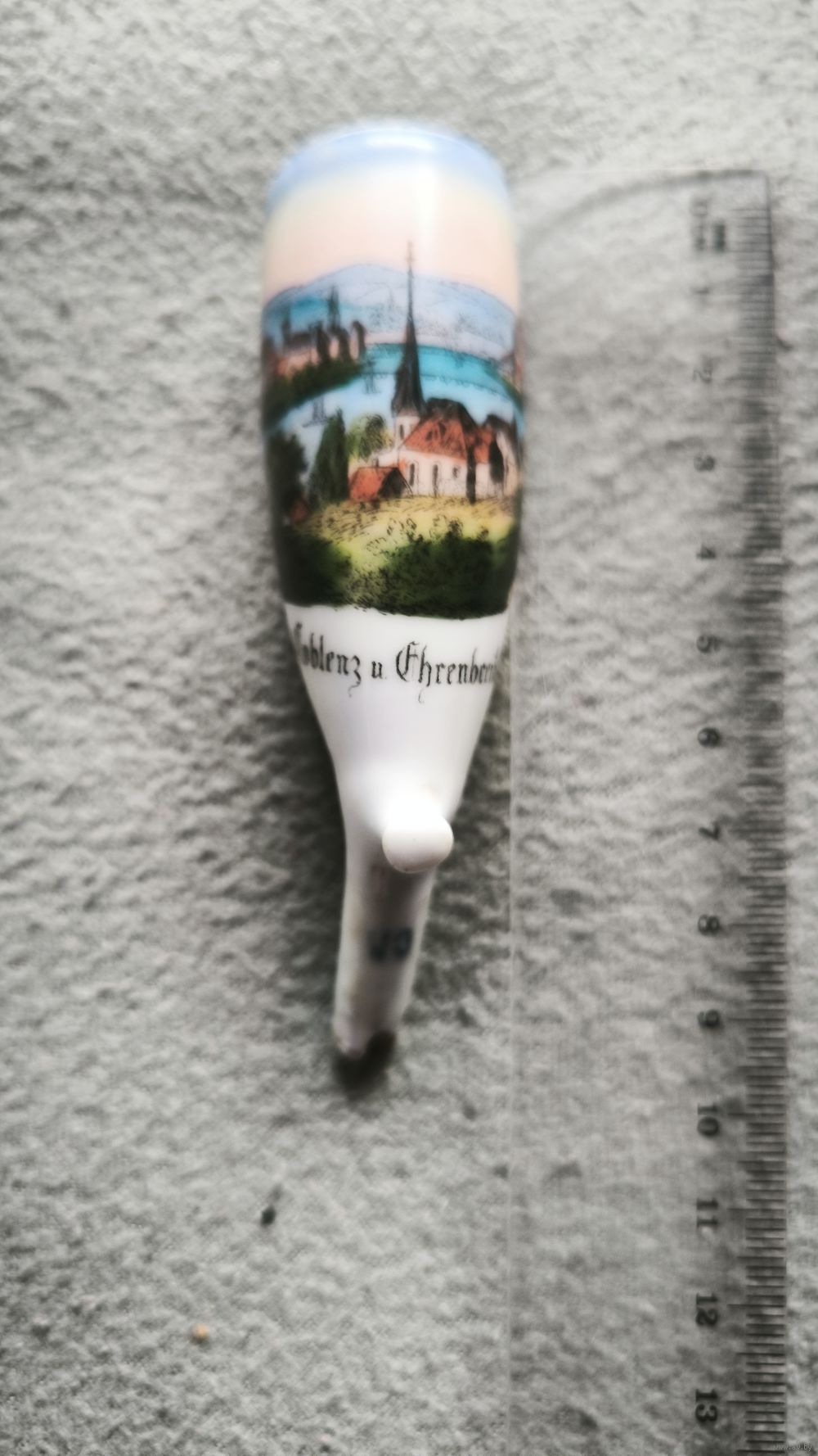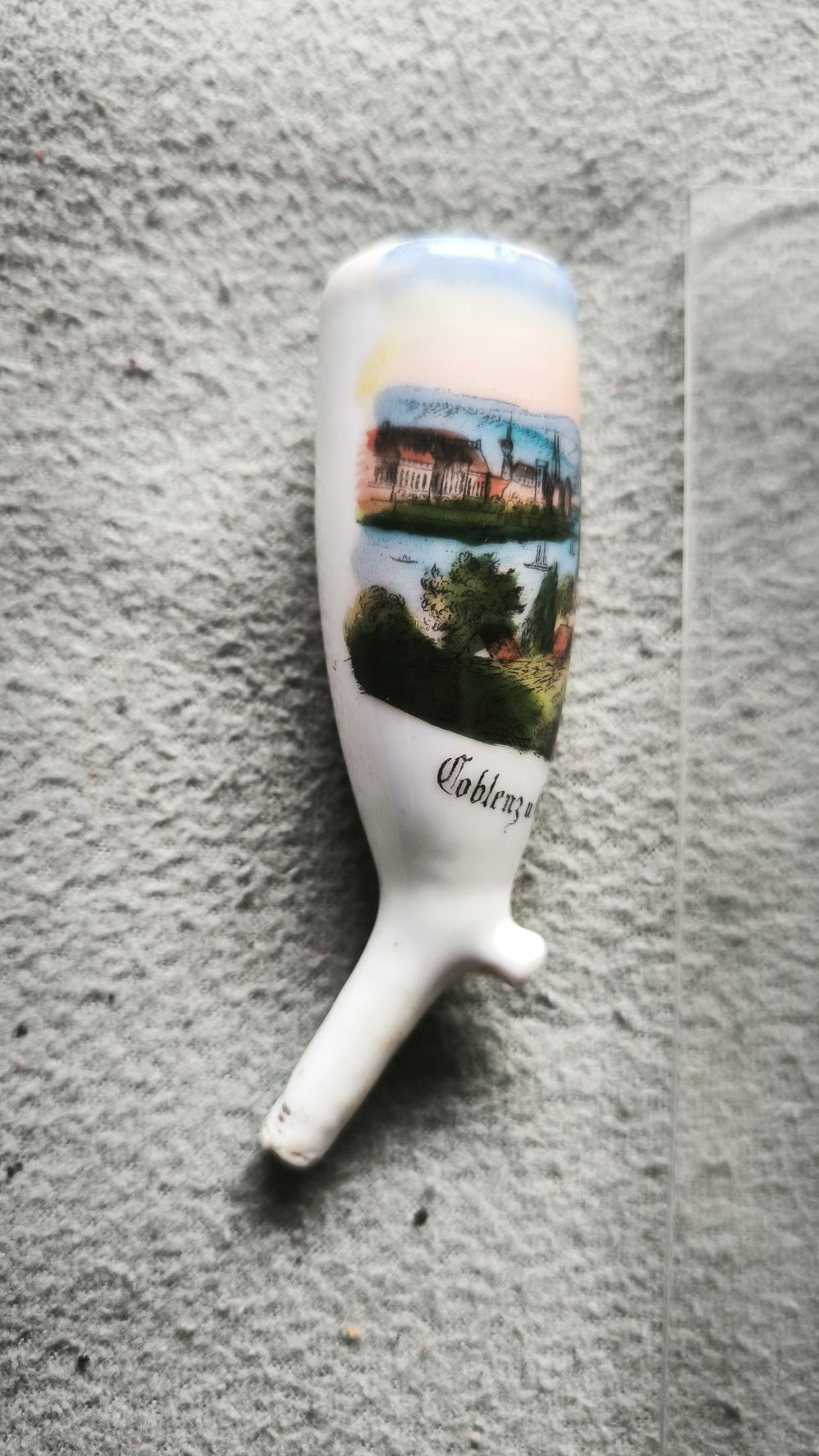 Такие трубки покупались путешественниками в XIX веке в качестве памятного сувенира о «Гранд-туре» по Рейну. Изображение включает в себя историческую архитектуру города Кобленц и знаменитую крепость. Текст выполнен готическим шрифтом: "Koblenz u. Ehrenbreitstein".