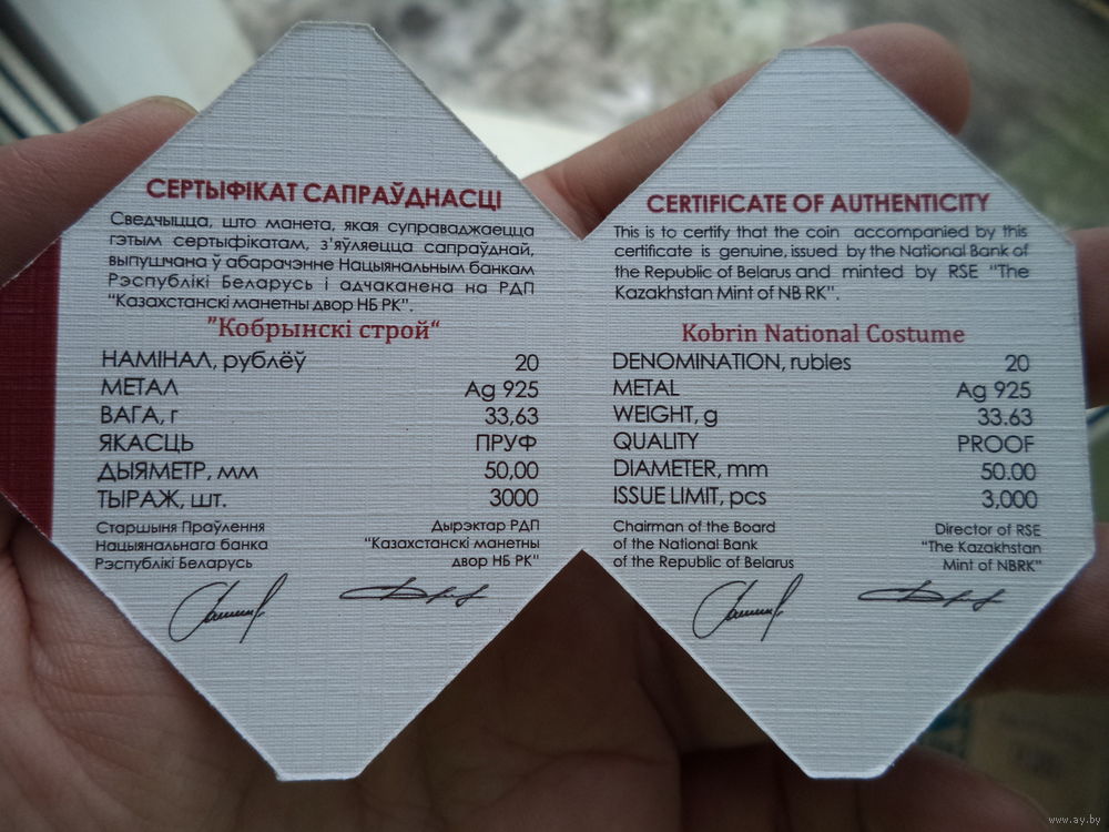 по кругу вверху – рельефное изображение Государственного герба Республики Беларусь и надпись: РЭСПУБЛІКА БЕЛАРУСЬ; в центре изображение элементов национального белорусского костюма; внизу – номинал 20 РУБЛЁЎ, слева – проба сплава, справа ‒ год чеканки.