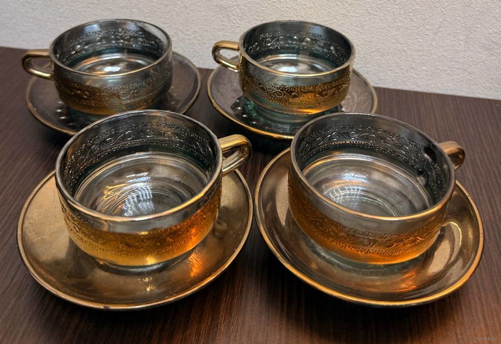 Кофейный набор (чашки с блюдцами) из цветного стекла с позолотой (СССР) для 4 персон.