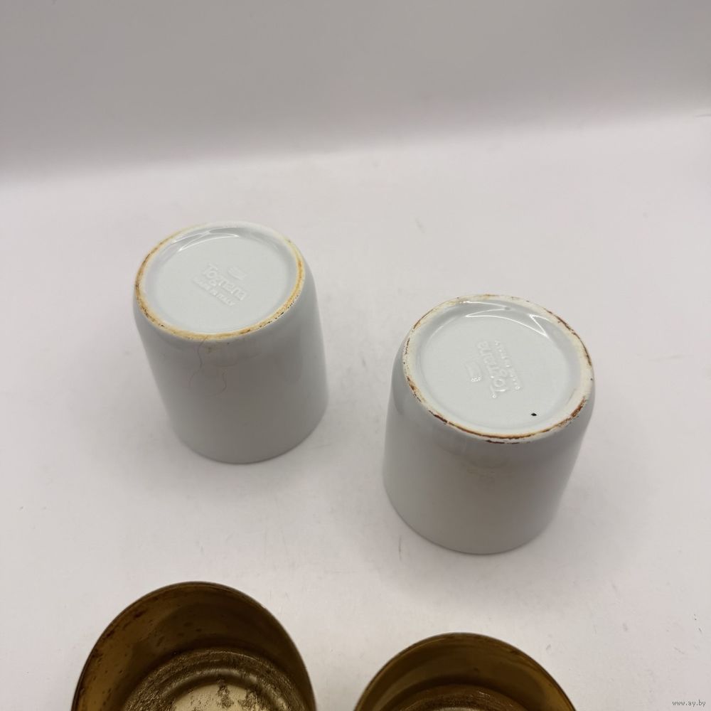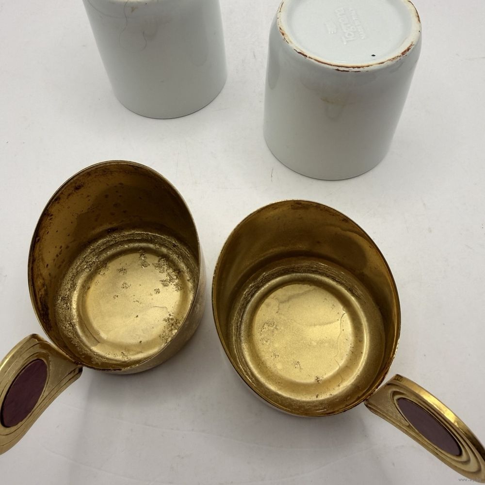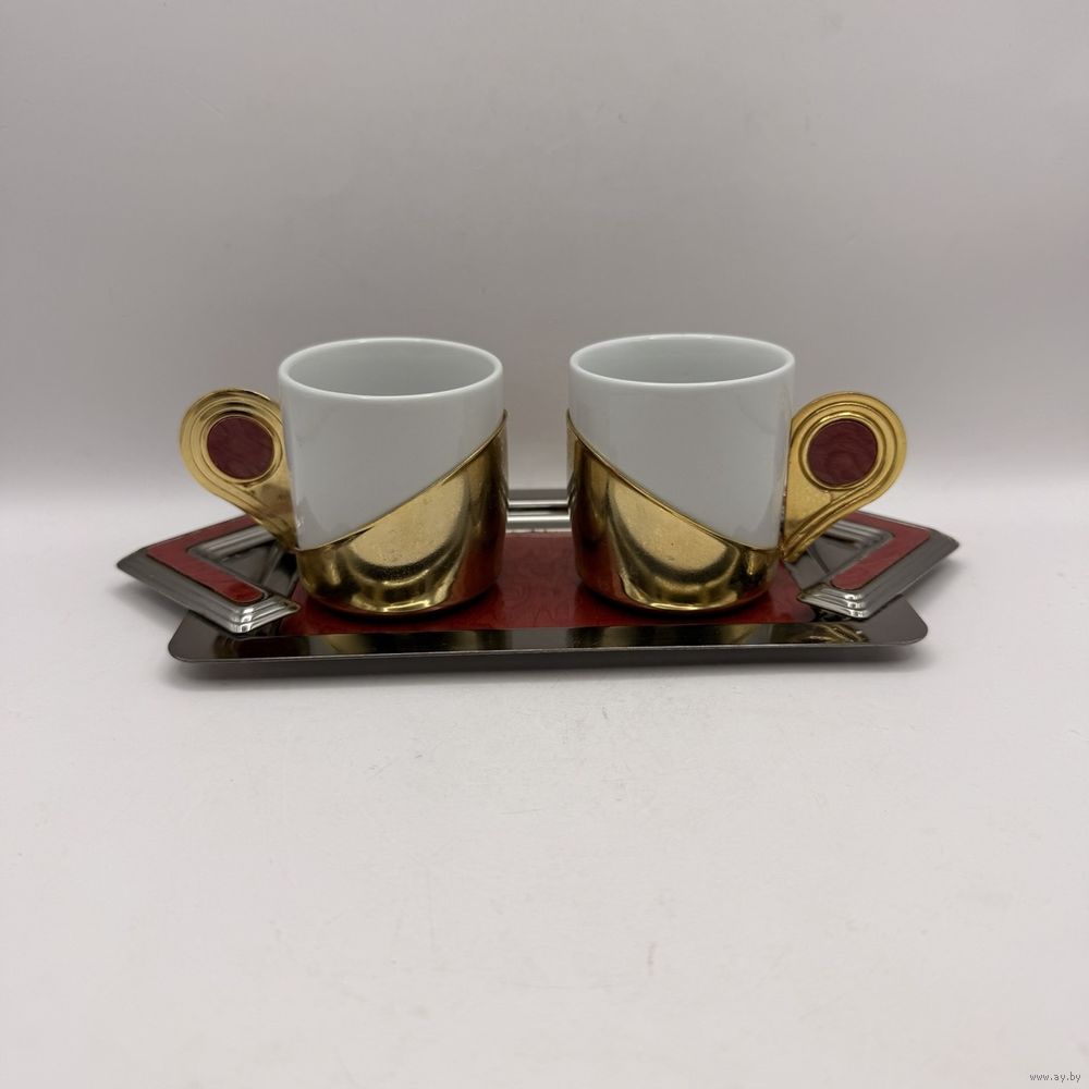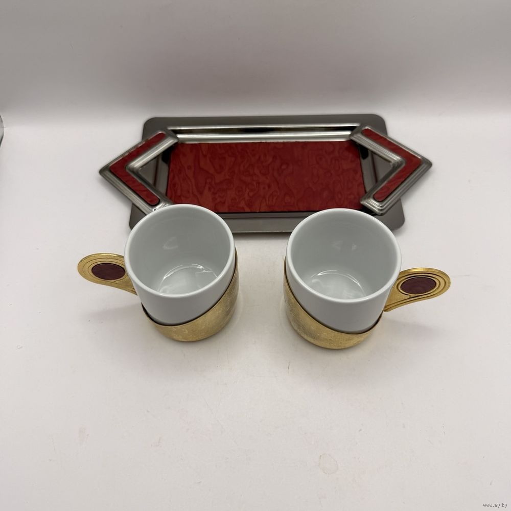 Винтажный кофейный сервиз на 2 персоны, в стиле Ар-деко. Фарфоровые чашки для эспрессо в латунных подстаканниках и металлическим подносом в комплекте. Подстаканники и поднос декорированы вставками из композитного материала. Италия. Высота чашки 6 см, объем 80 мл. Размер подноса 22 х 10 см. Следы бытования, следы коррозии внутри подстаканников и под ручками подноса, в целом не видны (см. фото, учтено в цене).