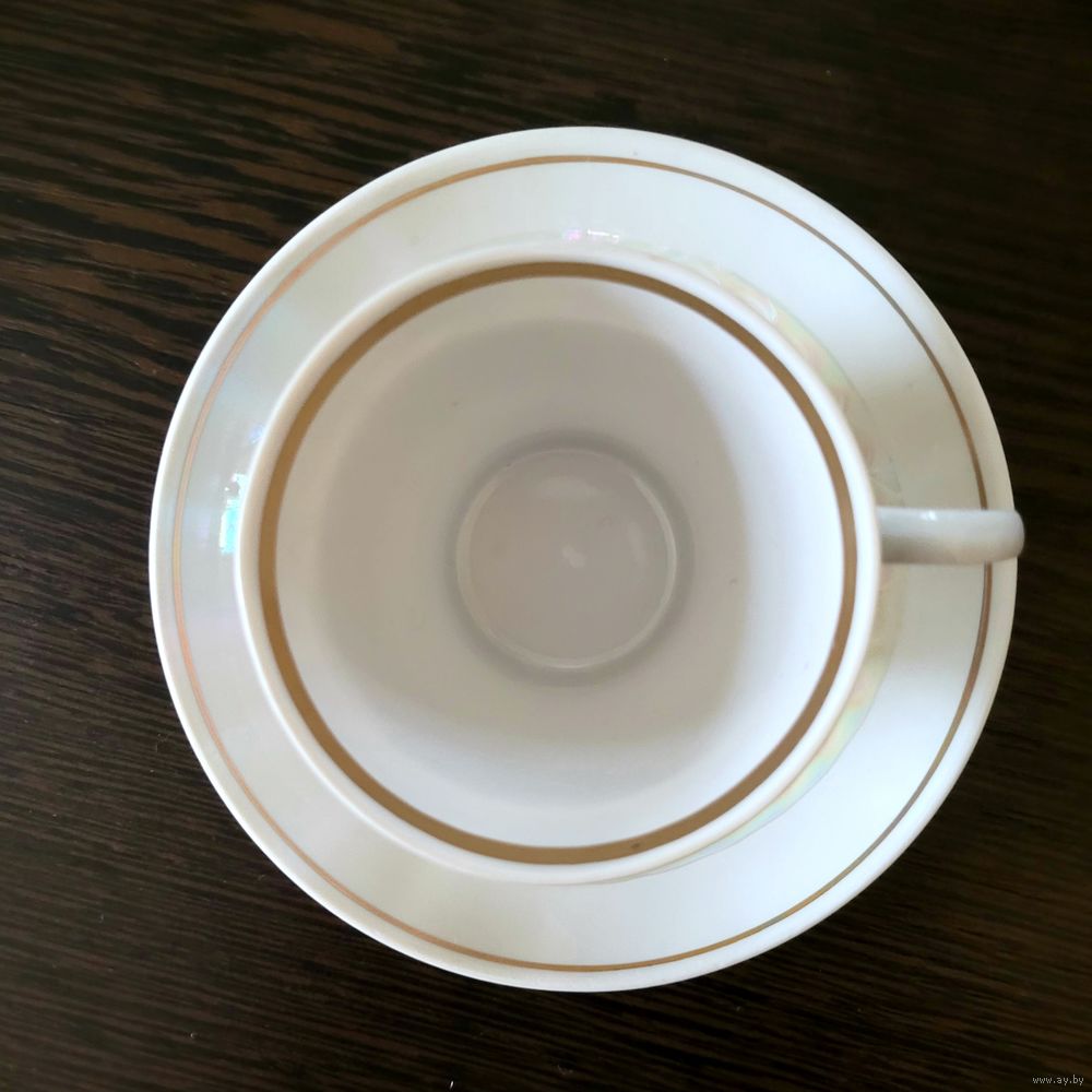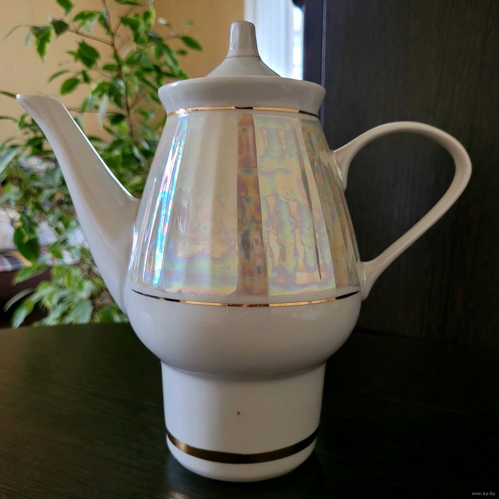Кофейный сервиз, фарфор, люстр, отводка золотом, рельеф. Кофейник и 6 кофейных пар (чашка 100 мл и блюдце 12 см). Минский фарфоро-фаянсовый завод, зеленое клеймо.