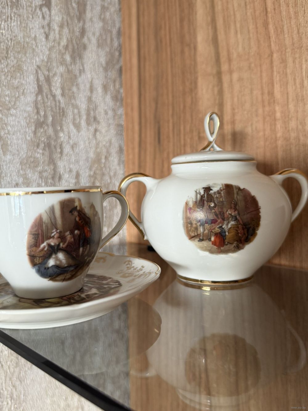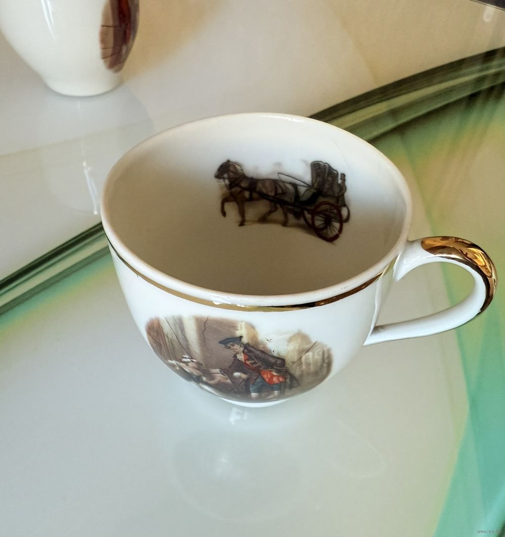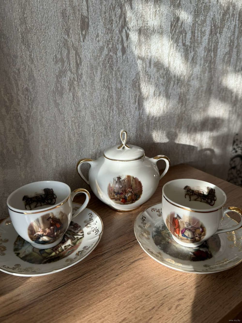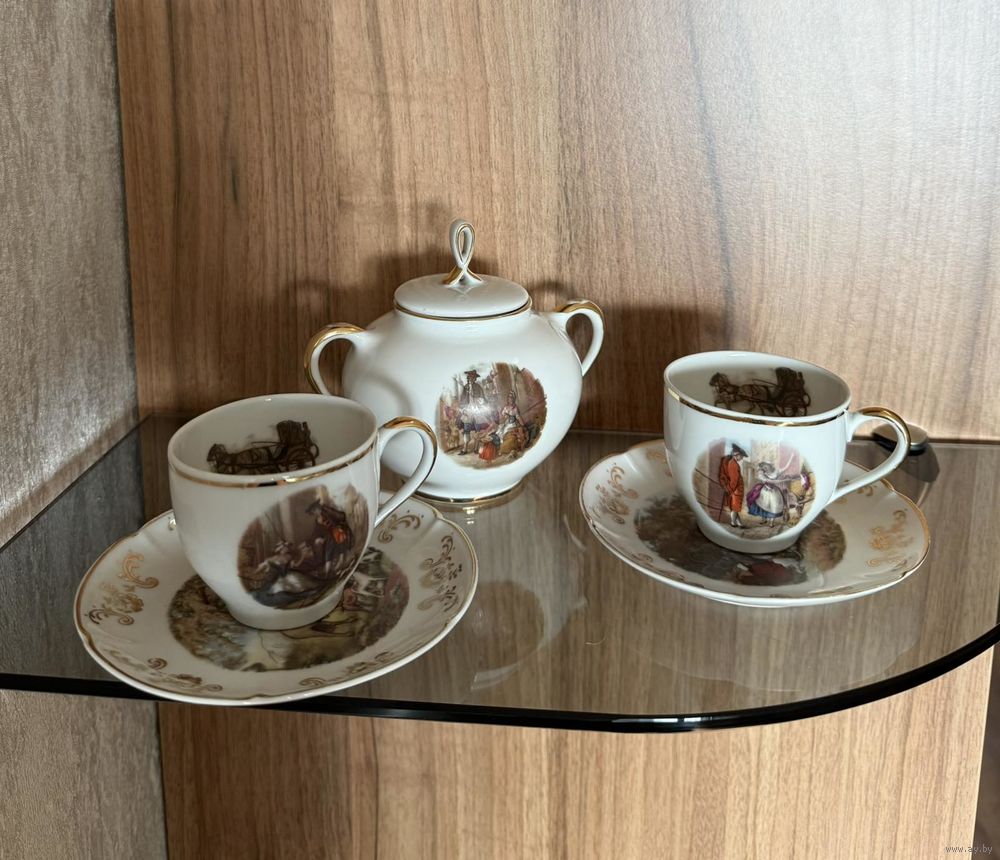 Фарфор сервиза выглядит гладким и блестящим. Чашки и сахарница имеют золотистую окантовку по краям. Блюдце украшено золотистым орнаментом в виде цветов и завитков по краю, что указывает на то, что это фарфор высокого качества.