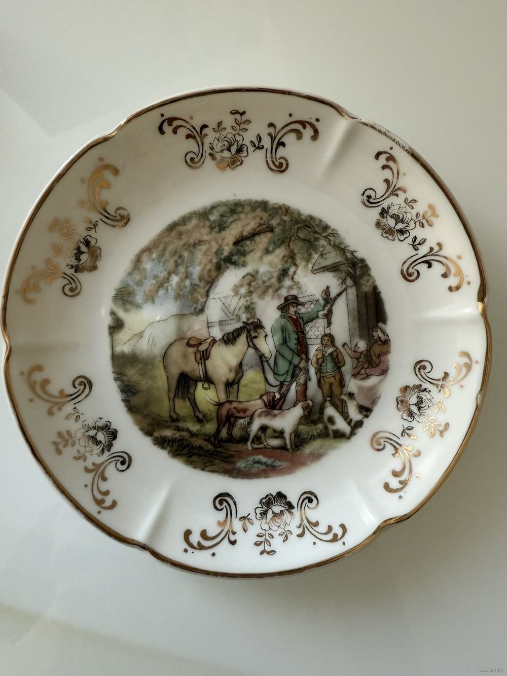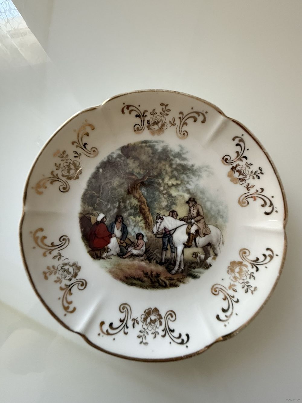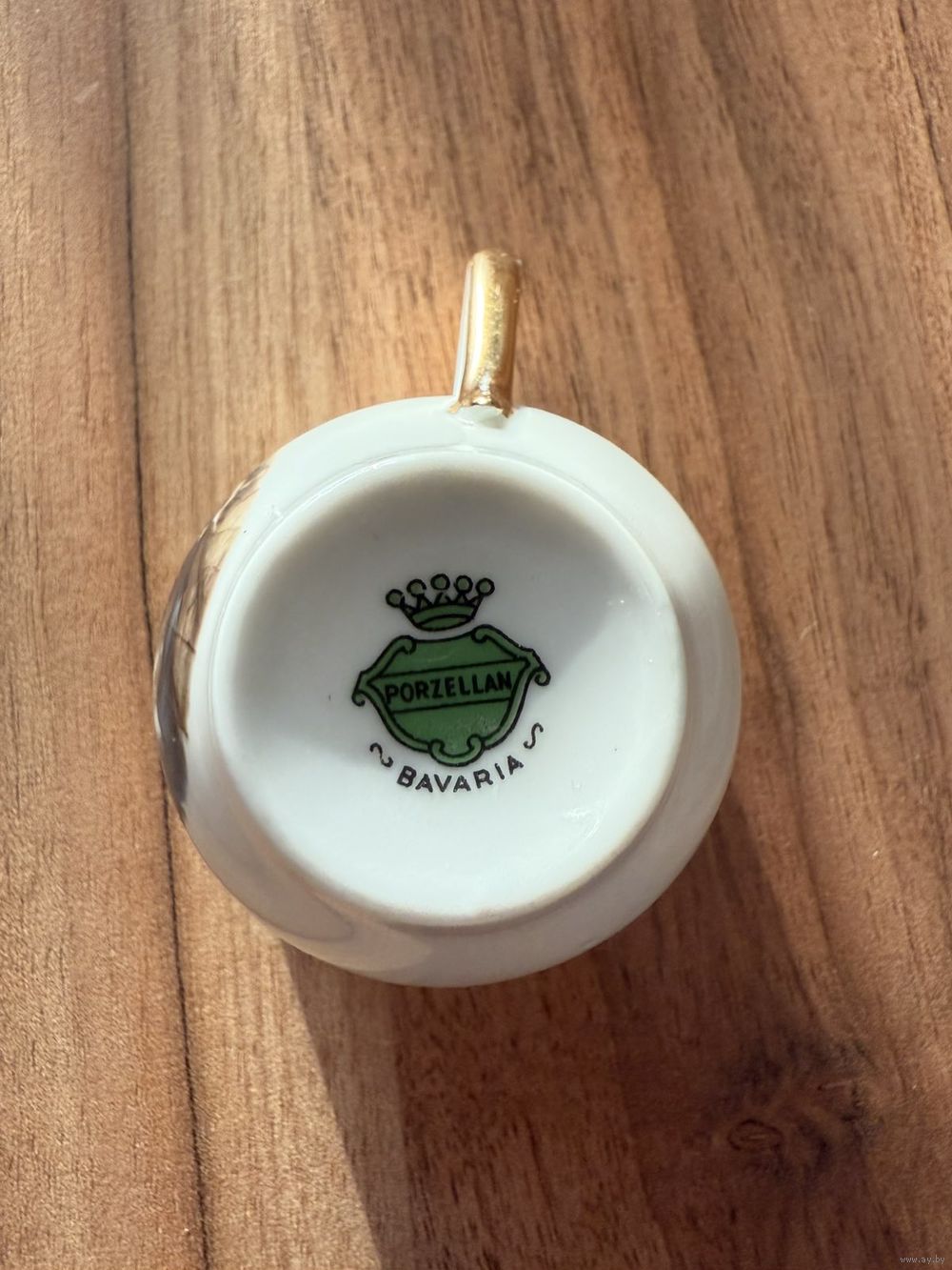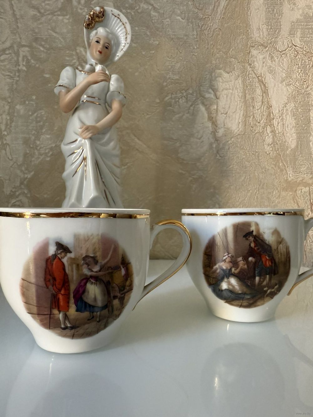 Фарфор сервиза выглядит гладким и блестящим. Чашки и сахарница имеют золотистую окантовку по краям. Блюдце украшено золотистым орнаментом в виде цветов и завитков по краю, что указывает на то, что это фарфор высокого качества.