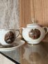 На блюдцах изображены сцены охоты. На чашках и сахарнице изображены бытовые сцены в интерьере. Женщины и мужчины одеты в костюмы эпохи рококо.