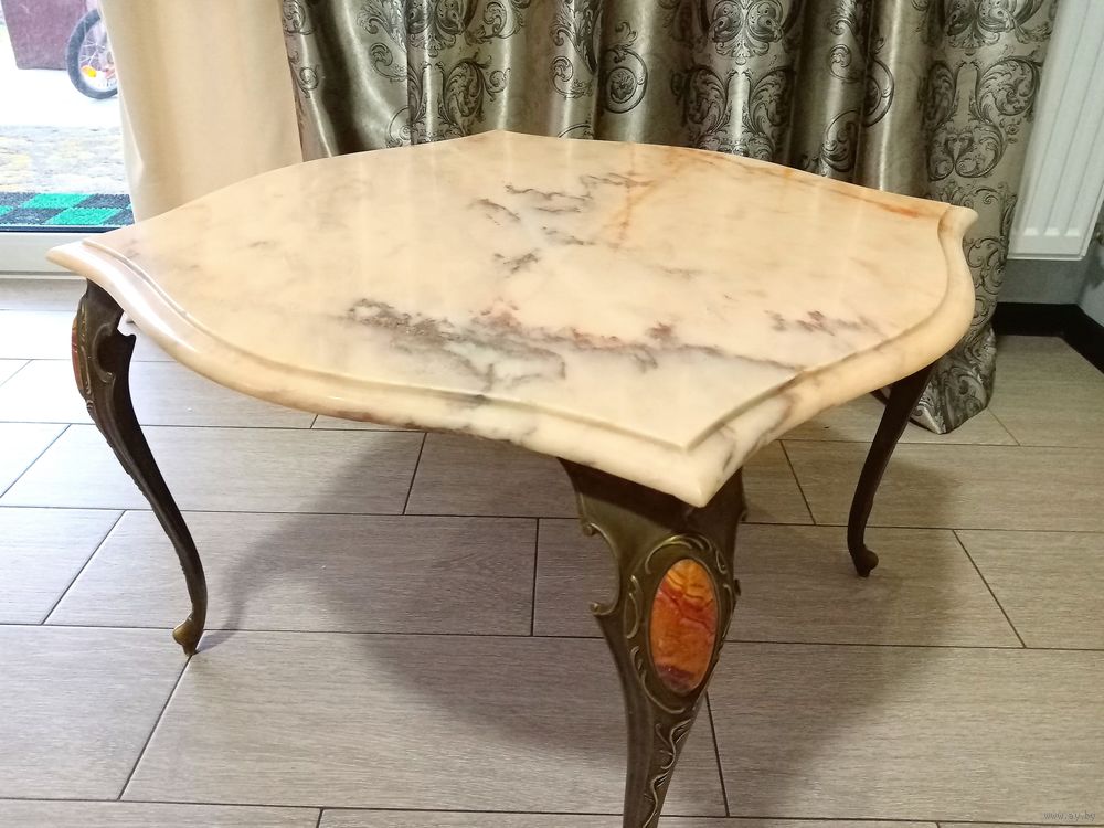Кофейный, журнальный столик. Италия.Столешница природный камень оникс, литые латунные ножки с вставками мрамора. Без дефектов и повреждений.Высота 42 см столешница 66-66 см. Подробнее по телефону или вайбер, WhatsApp. Больше фото и видео по запросу. Смотрите другие мои лоты много интересных и оригинальных вещей для вашего.