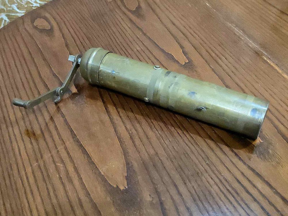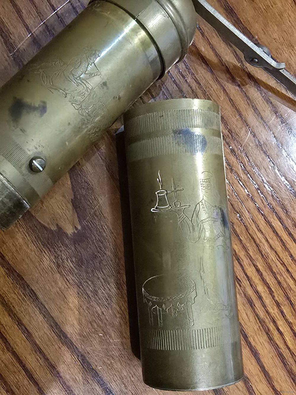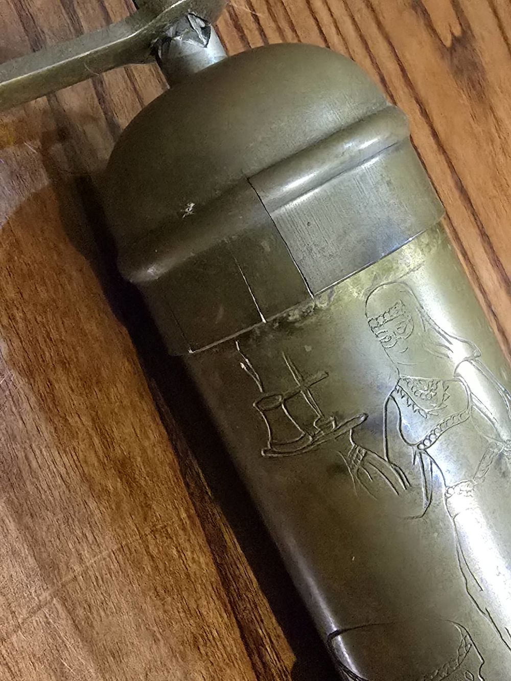 Тяжелая латунная кофемолка. На корпусе резьба в восточном стиле. На крышке есть трещины. Работе механизма они не мешают.