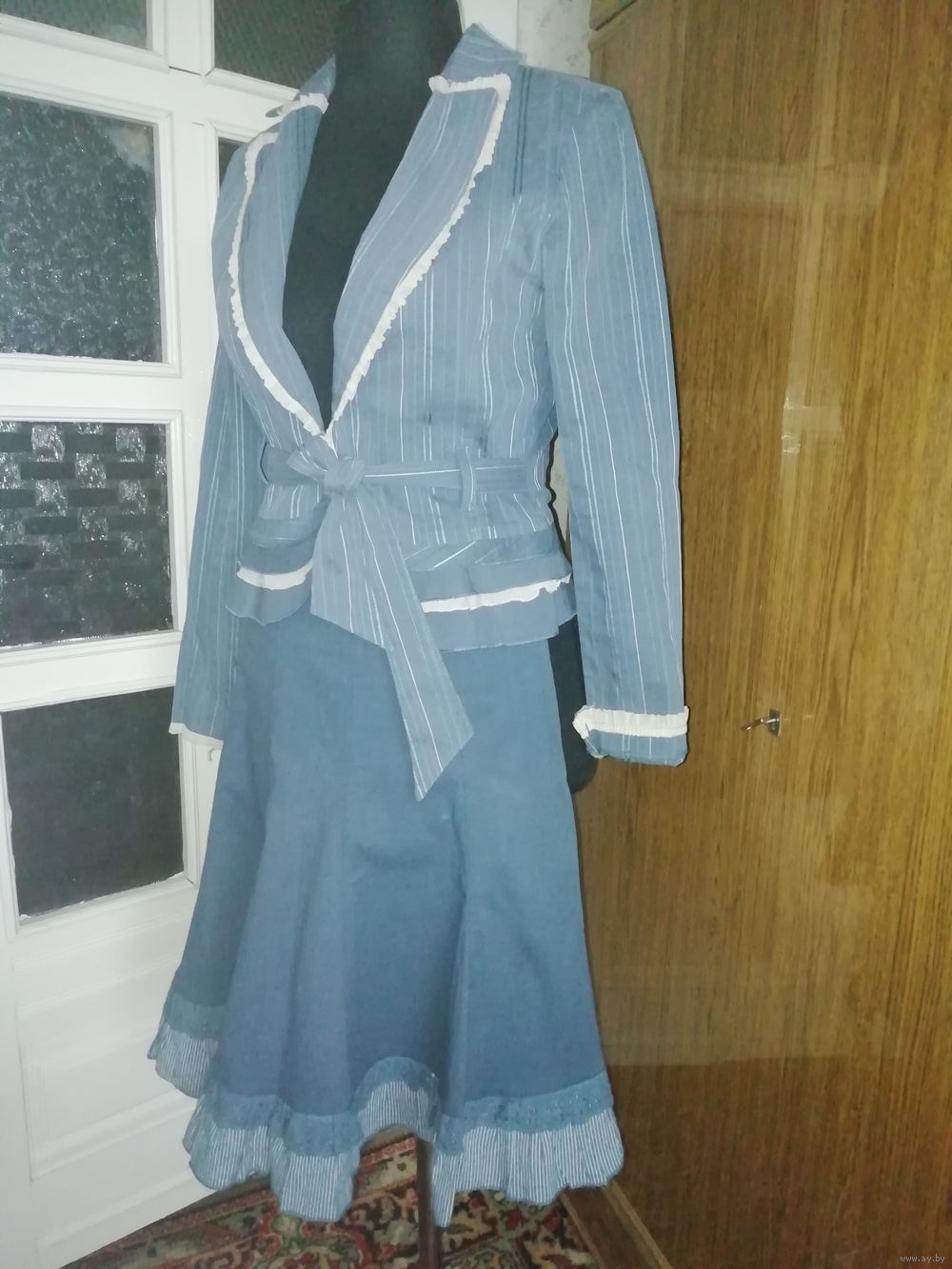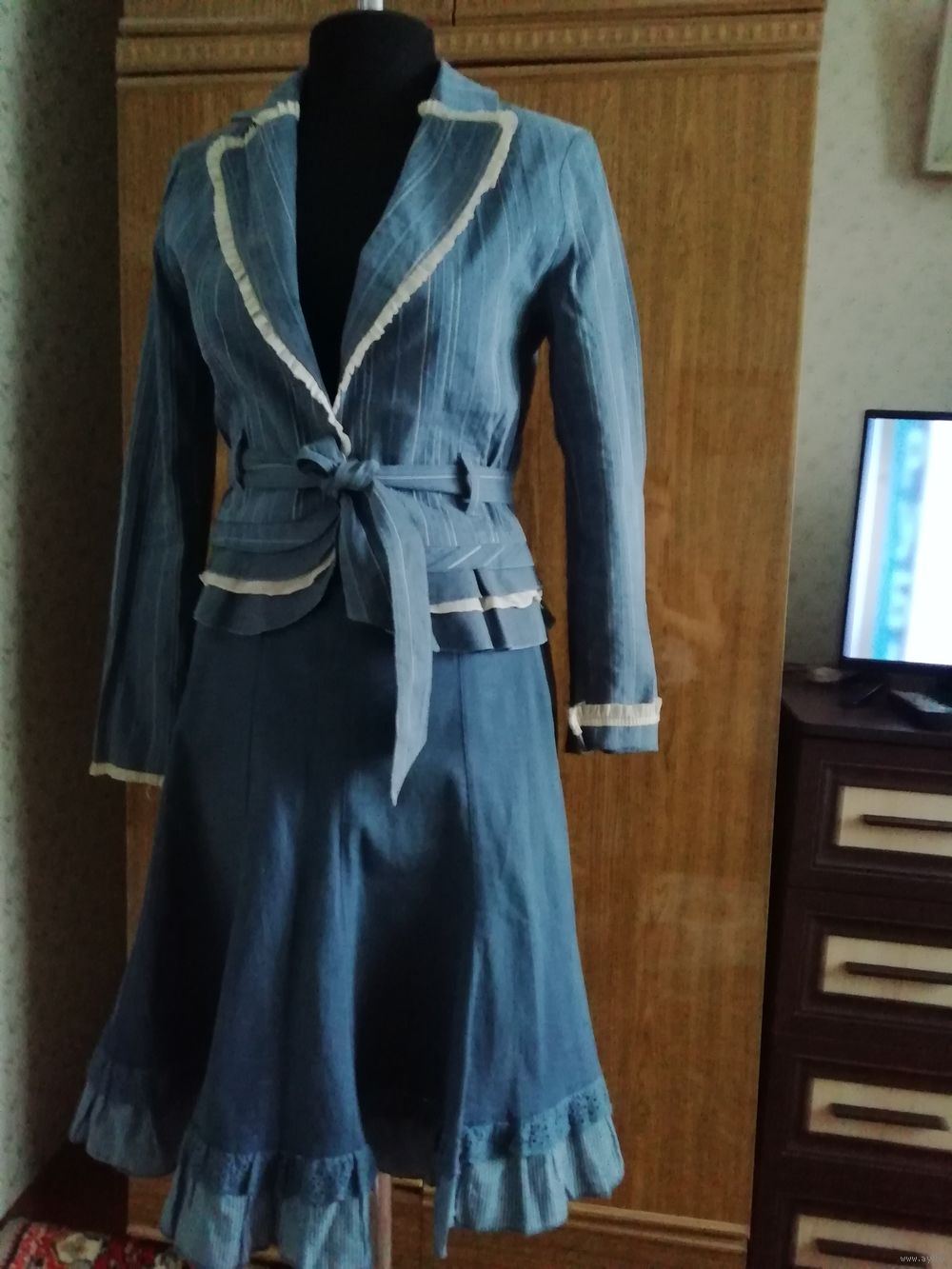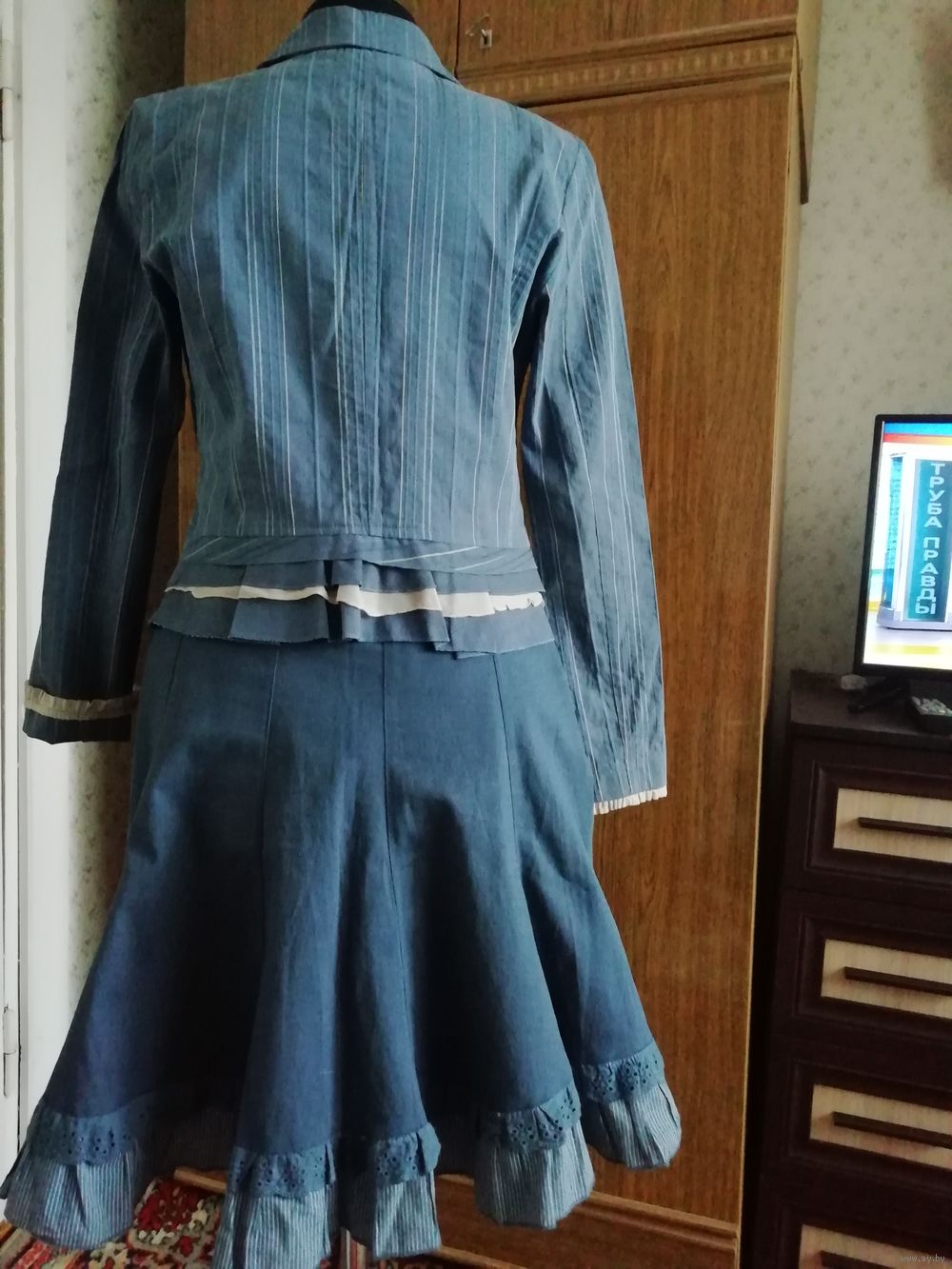 | Юбка 10 клиньев, на молнии, длинна 58см, ткань хорошей текстуры. Пиджачек по спинке от плеча 55см,баска оригинальная;рукав 61см,можно с отворотом, как манжетик. Костюм очень мило смотрится. | |
