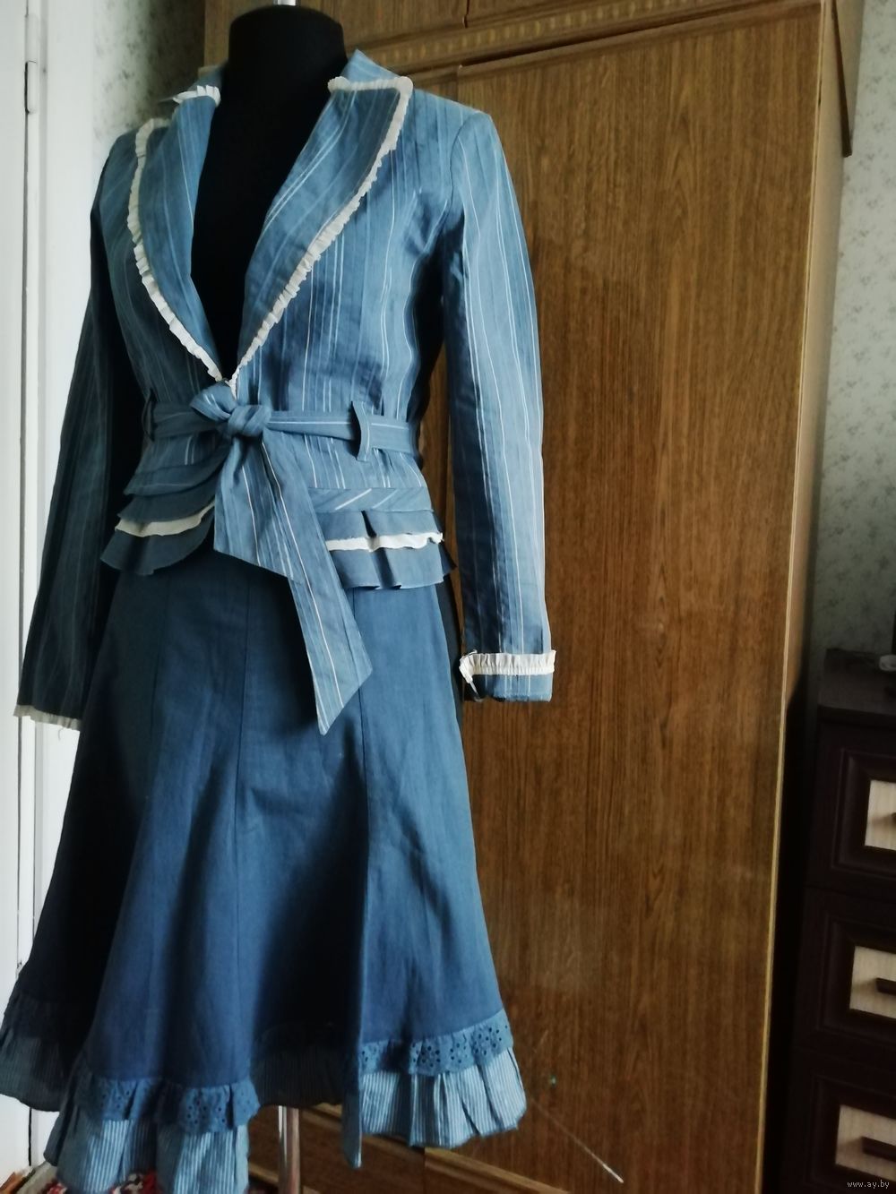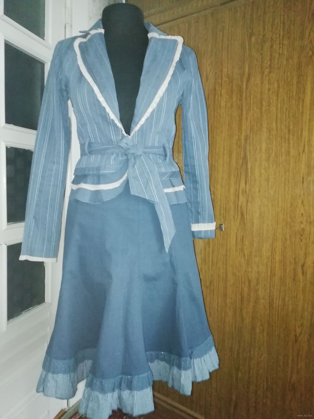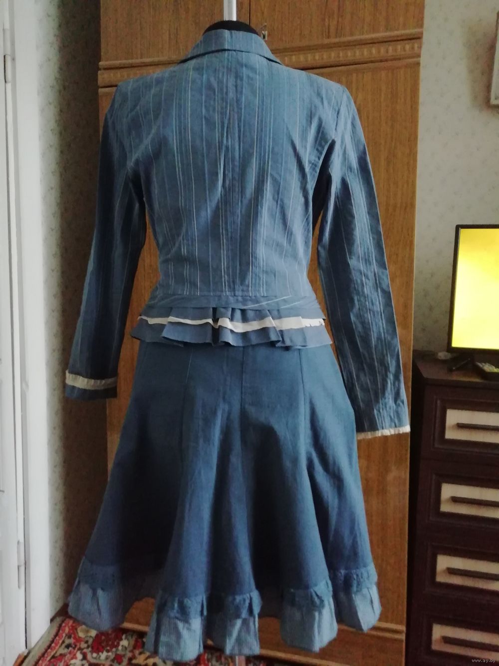 | Юбка 10 клиньев, на молнии, длинна 58см, ткань хорошей текстуры. Пиджачек по спинке от плеча 55см,баска оригинальная;рукав 61см,можно с отворотом, как манжетик. Костюм очень мило смотрится. | |