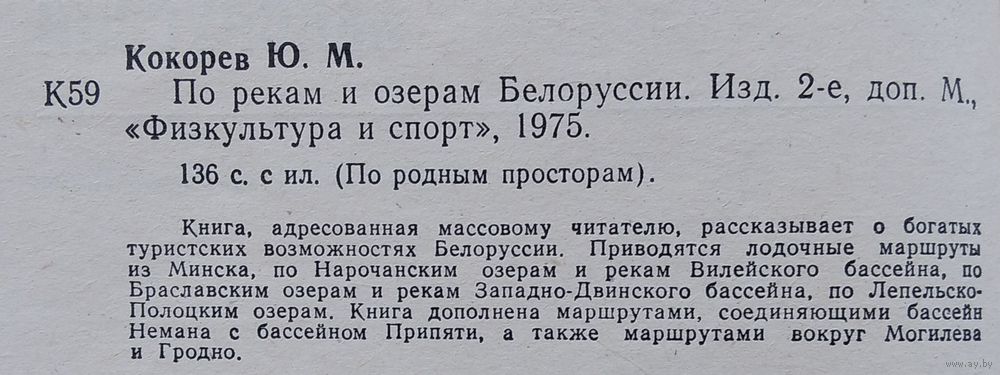 Кокорев, Юрий Михайлович. По рекам и озерам Белоруссии. (По родным просторам). 2-е изд., доп. Москва : Физкультура и спорт, 1975. - 136 с. Мягкая обложка. Умен.формат.