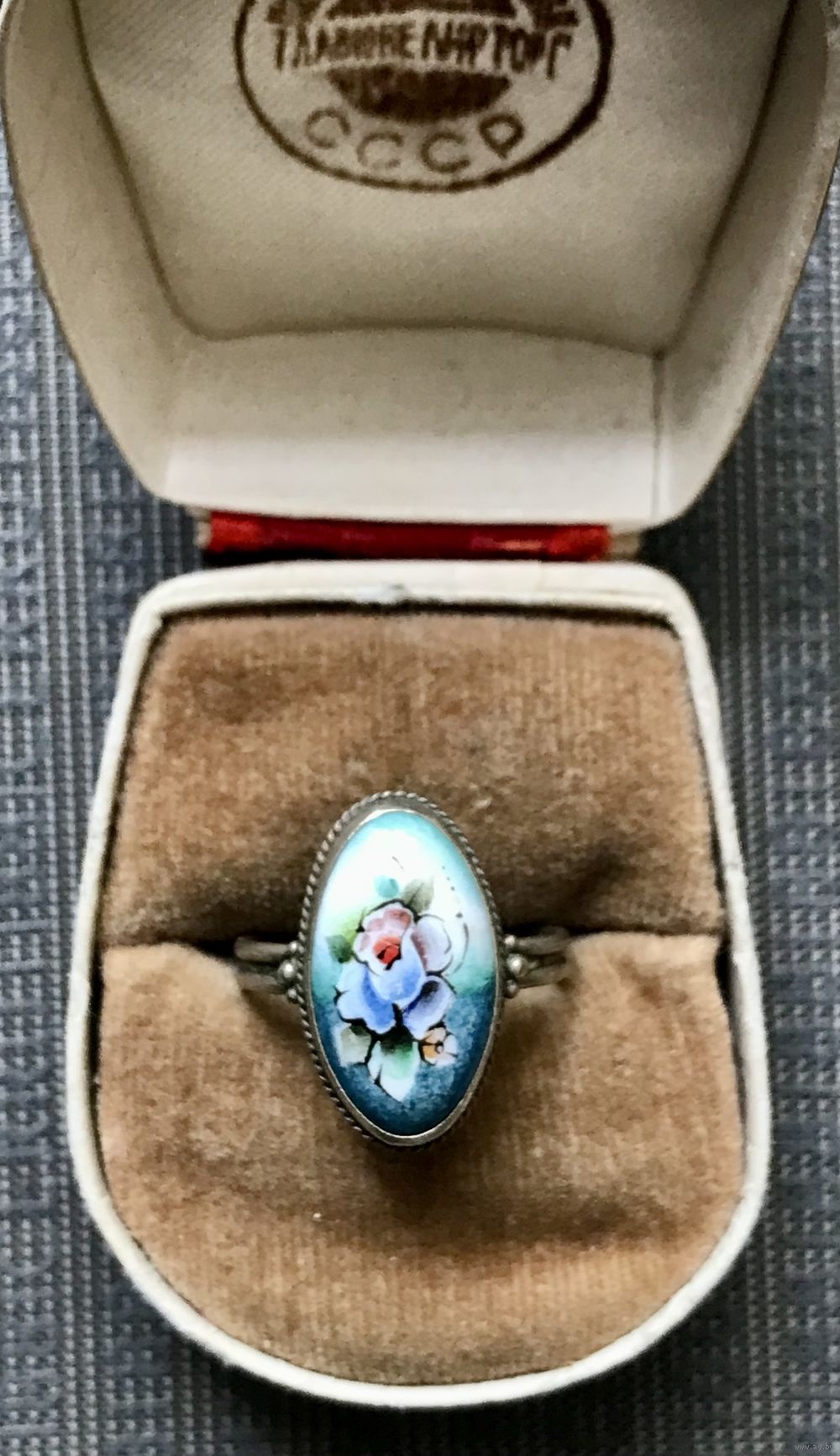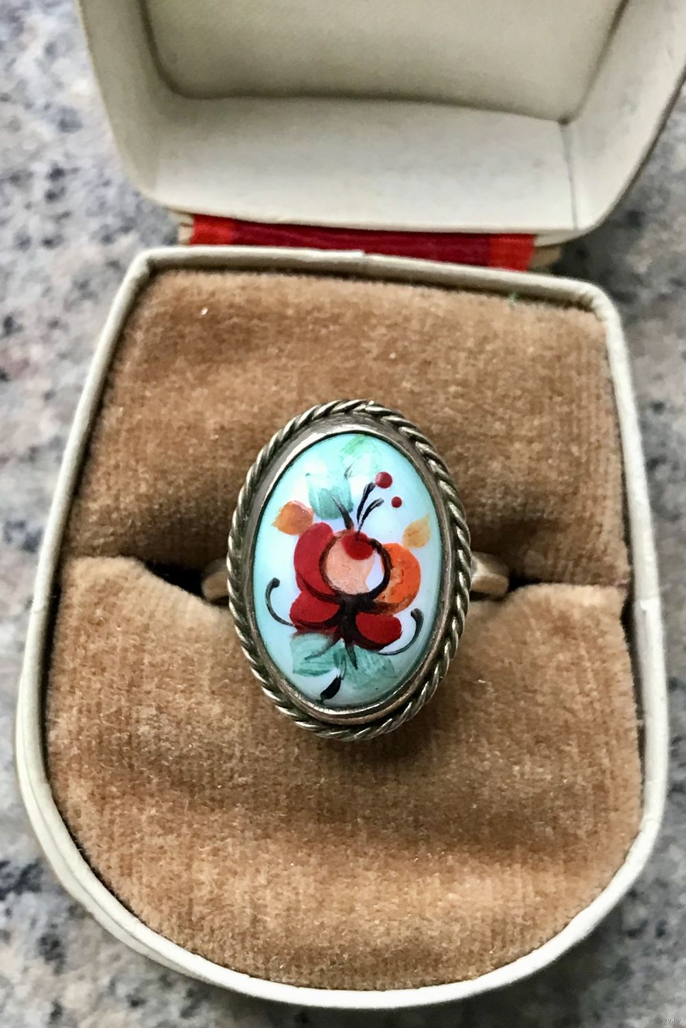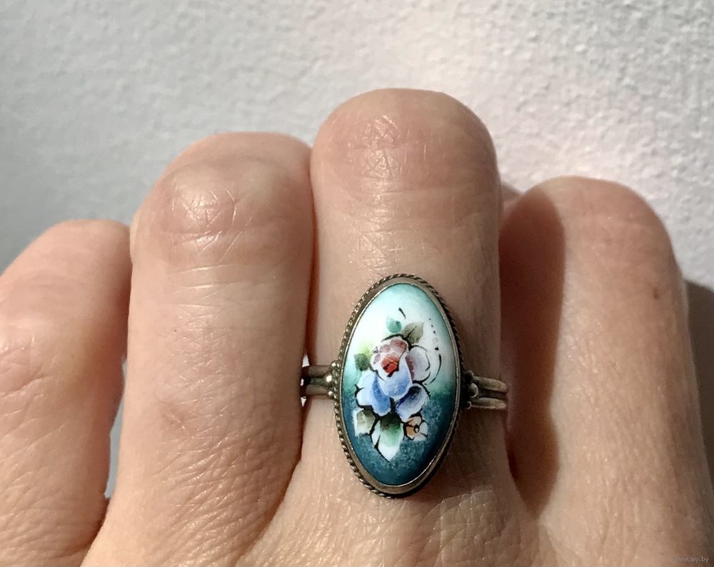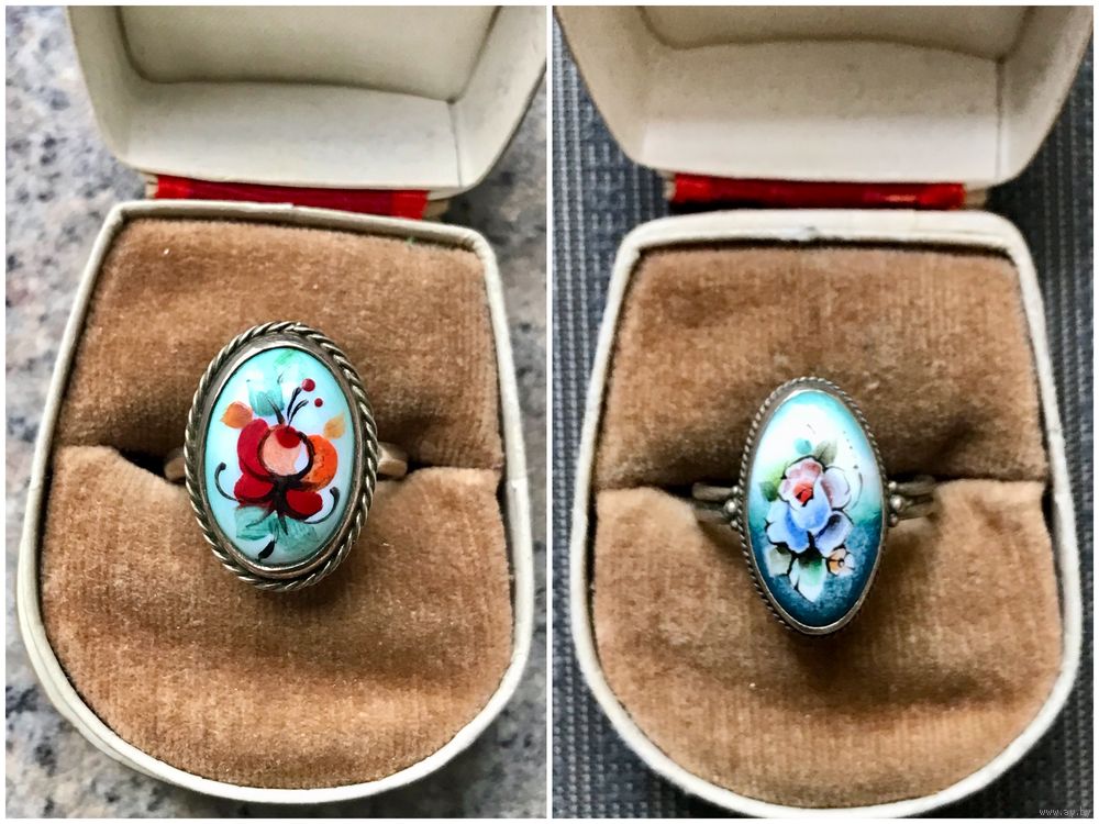 1. Винтажное кольцо с основой из мельхиора и вставкой финифти. Высота каста 2см., размер кольца 18. Состояние хорошее.