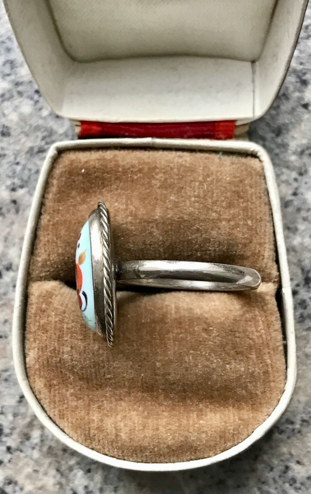 2. Винтажное кольцо с основой из мельхиора и вставкой финифти. Высота каста 2см., размер кольца 17. Состояние хорошее.