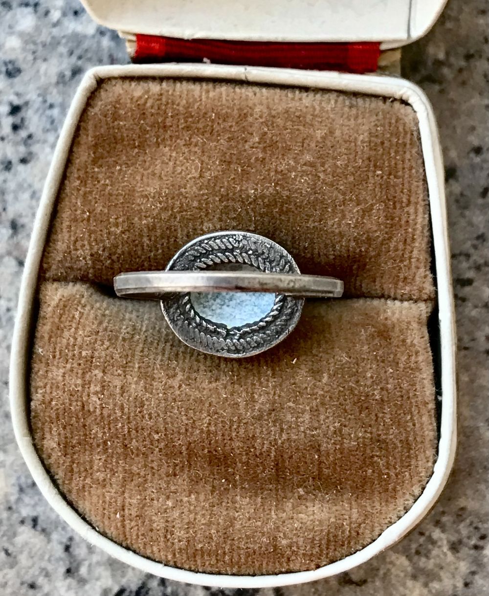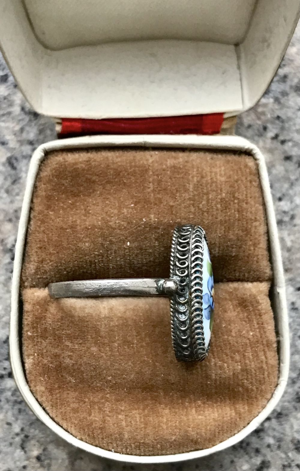 2.Винтажное кольцо из мельхиора со вставкой финифти. Высота центральной части 1,8см., вставка 1,5х0,7см. Размер 17-17,5. Состояние хорошее.