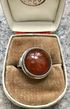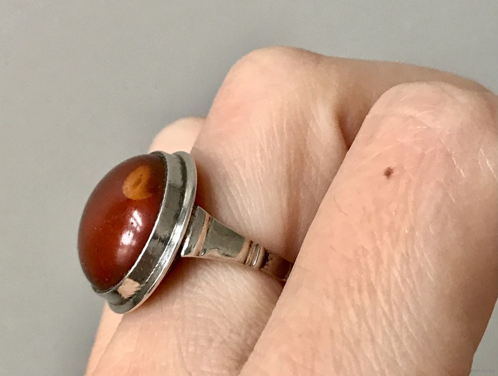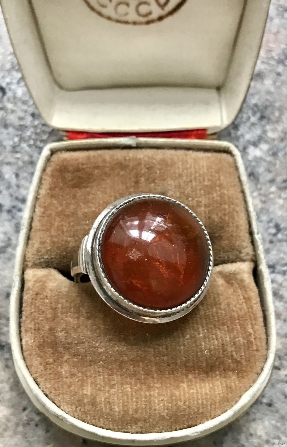 Винтажное кольцо из серебра 925пр.(стоят клейма Польши) и вставки из янтаря (на лицевой стороне есть небольшой скольчик). Диаметр вставки 1,7см., размер кольца 17, вес 5,36гр.