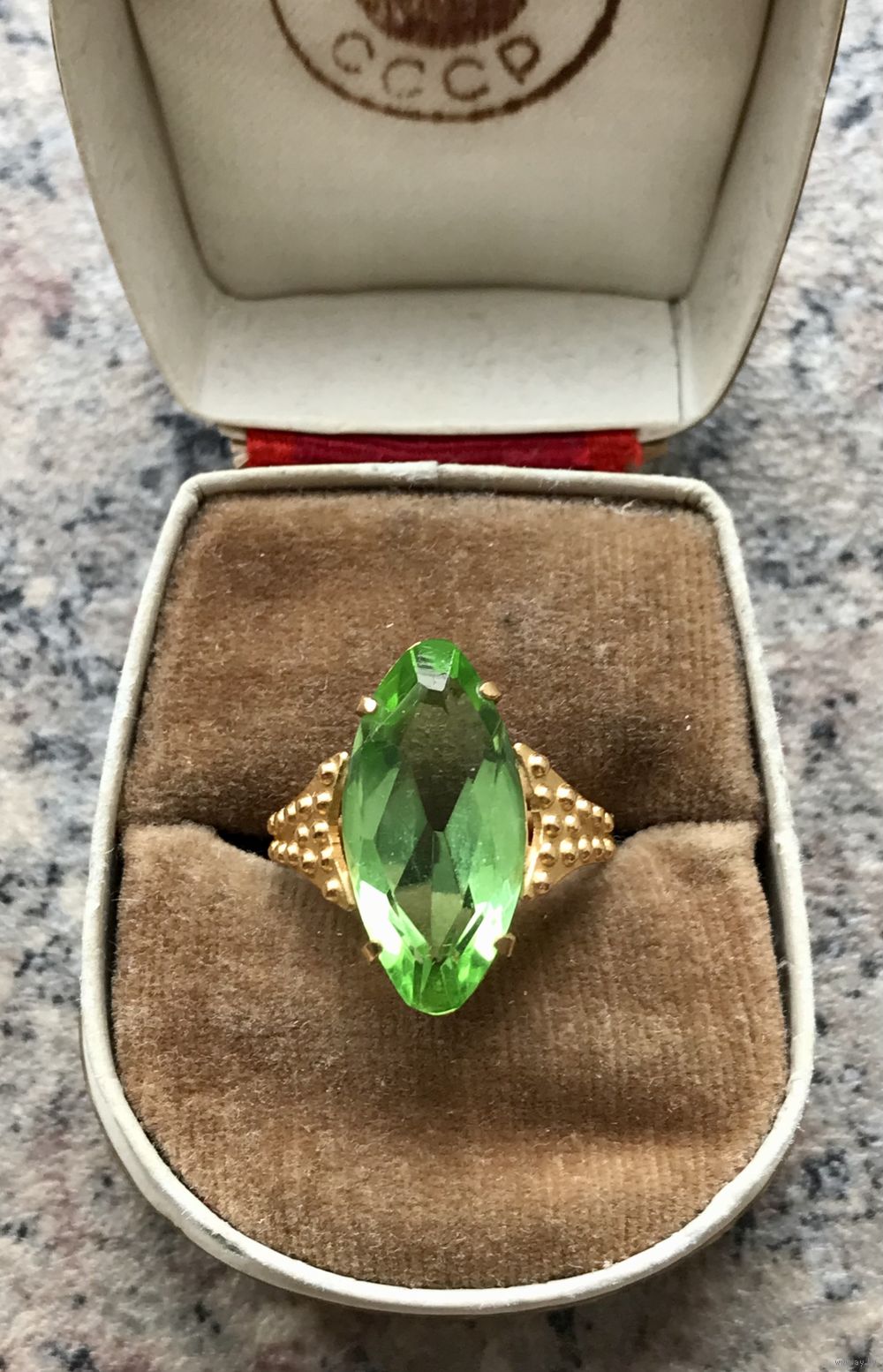 Винтажное кольцо с основой из латуни с позолотой (на шинке стоит отметка МКП) и вставкой из ювелирного стекла. Высота каста 2см., размер кольца 17-17,5. Состояние хорошее.