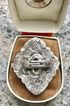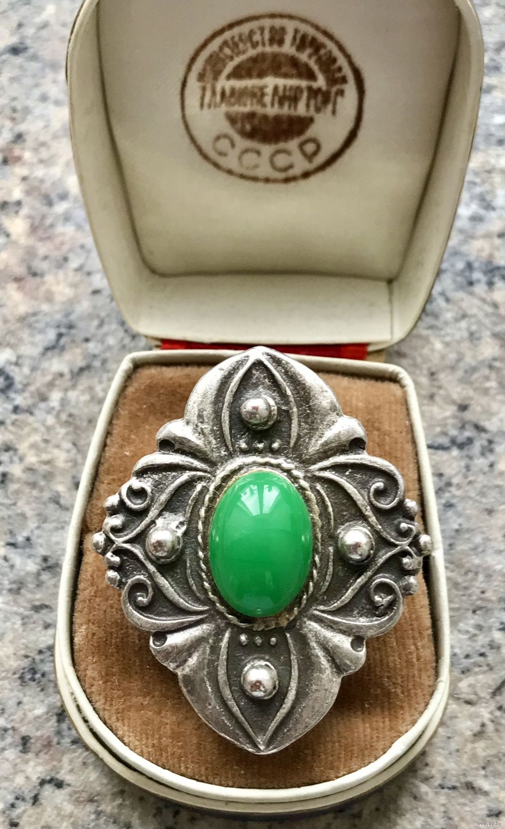 Крупное кольцо в этническом стиле из металла серебристого тона (похож на пьютер). Вставка из цветного стекла. Высота кольца 4см., ширина 3,5см. Вставка 1,3х0,9см. Безразмерное. Состояние хорошее.