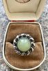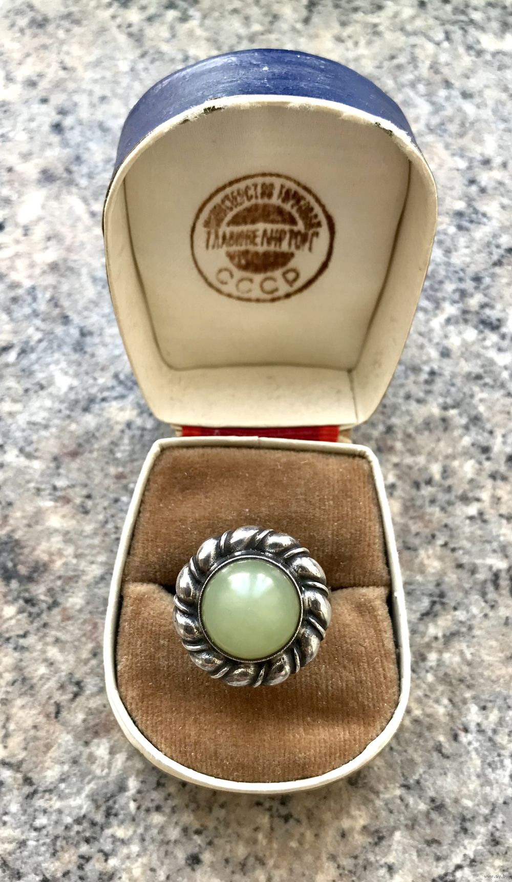 Крупное кольцо из серебра 925пр.(звезда) со вставкой из нефрита. Изготовлено в 1993г. в Харькове (именник :3ХЮ). Высота каста 1,7см., диаметр вставки 1см. Размер 18. Вес 8гр. Состояние хорошее.