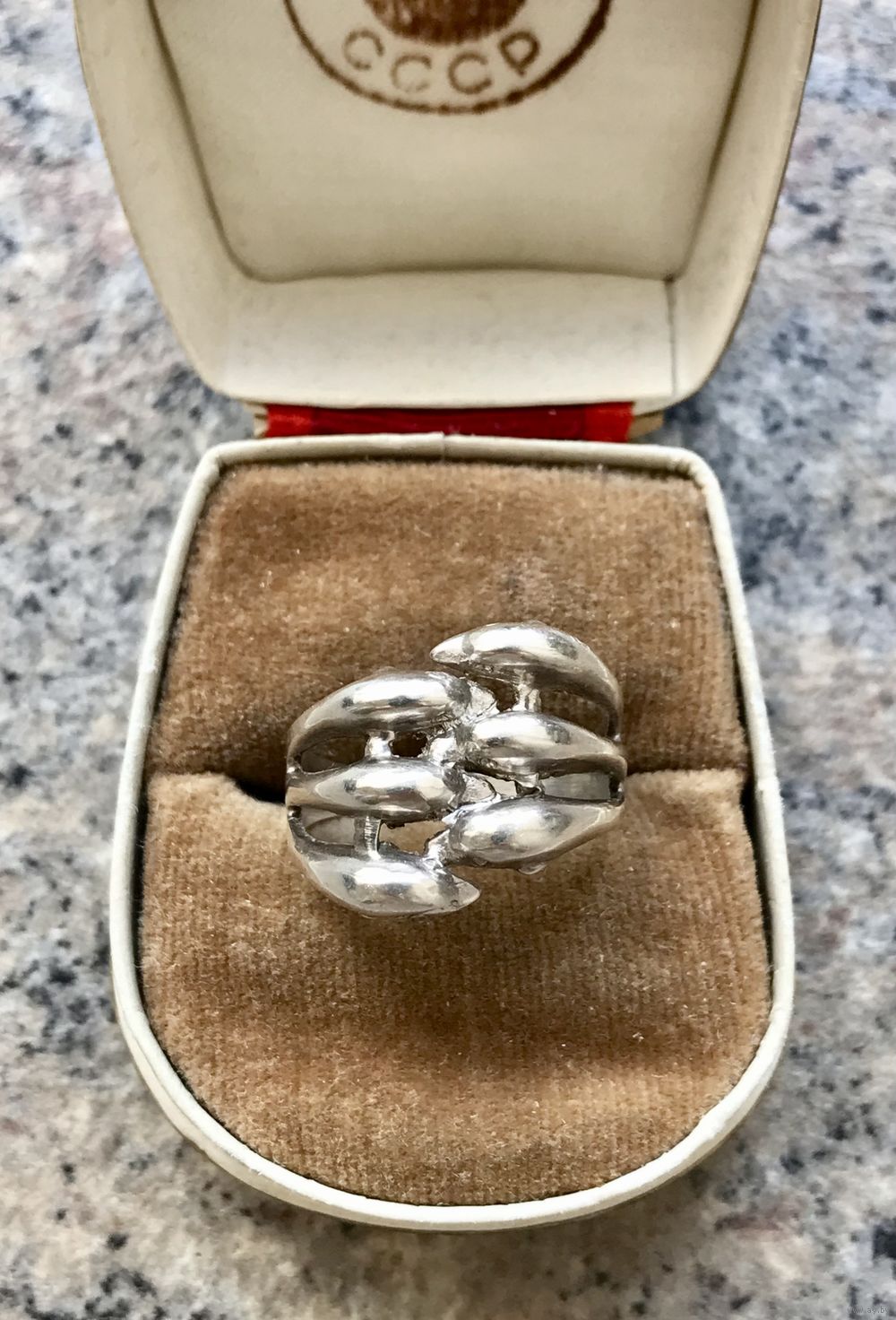 Кольцо из серебра 925пр.(внутри на шинке стоит отметка 925, также стоит российское пробирное клеймо). Высота каста 1,5см., размер кольца 18. Вес 5гр. Состояние хорошее.