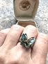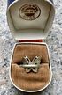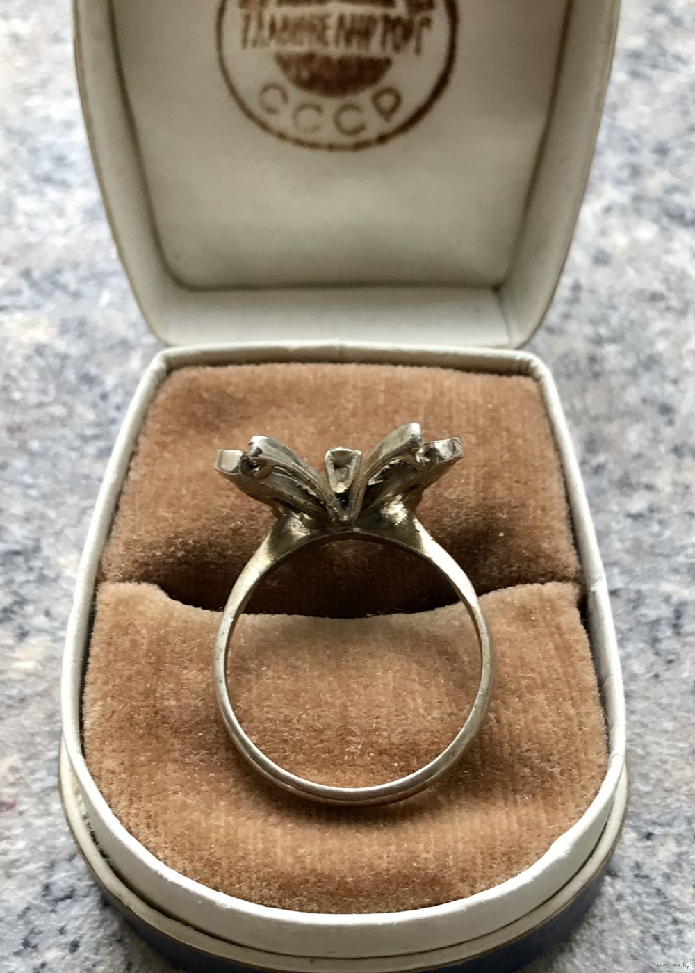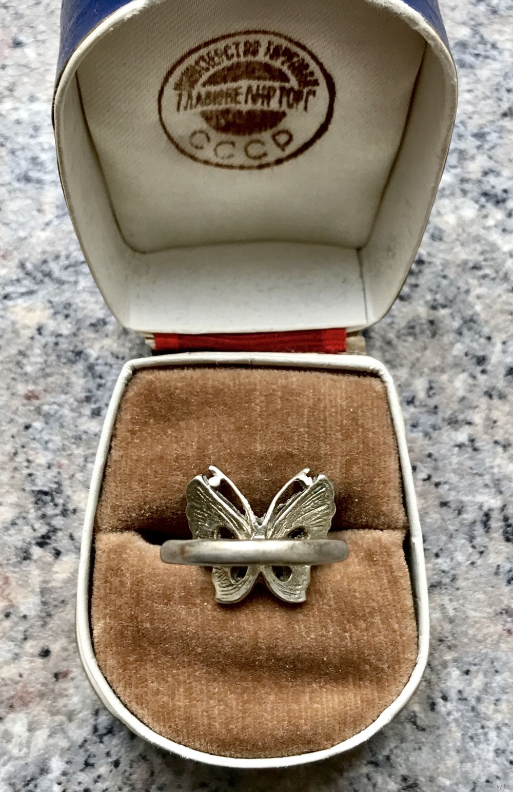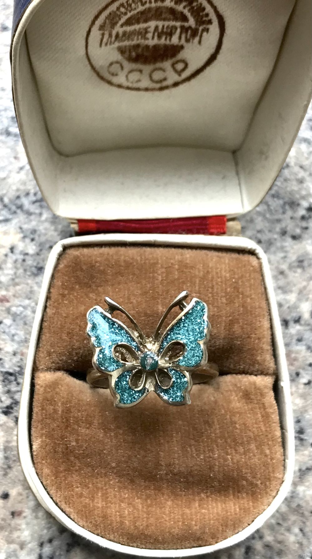 Винтажное кольцо в форме бабочки из мельхиора, на лицевой стороне эмаль. В серединке кольца есть небольшой скол эмали, в носке не бросается в глаза. Высота каста 1,5см. Размер 17-18.