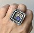 Крупное кольцо из металла серебристого тона (похож на пьютер). Вставки кристаллы насыщенного синего цвета. Высота каста 2,8см., ширина 2,8см.Безразмерное. Состояние хорошее.