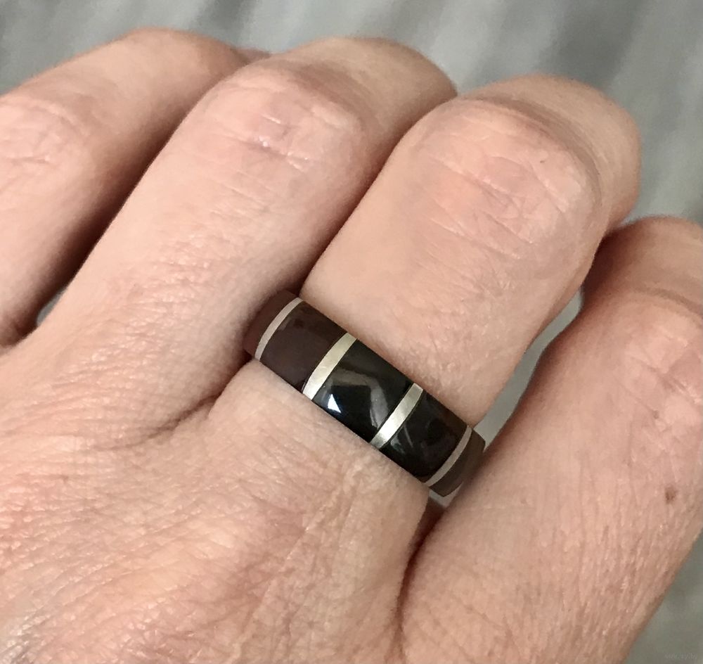 Винтажное кольцо из мельхиора и вставок из камня (яшма). Высота 0,5см., размер 17-17,5. Состояние хорошее.