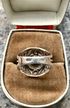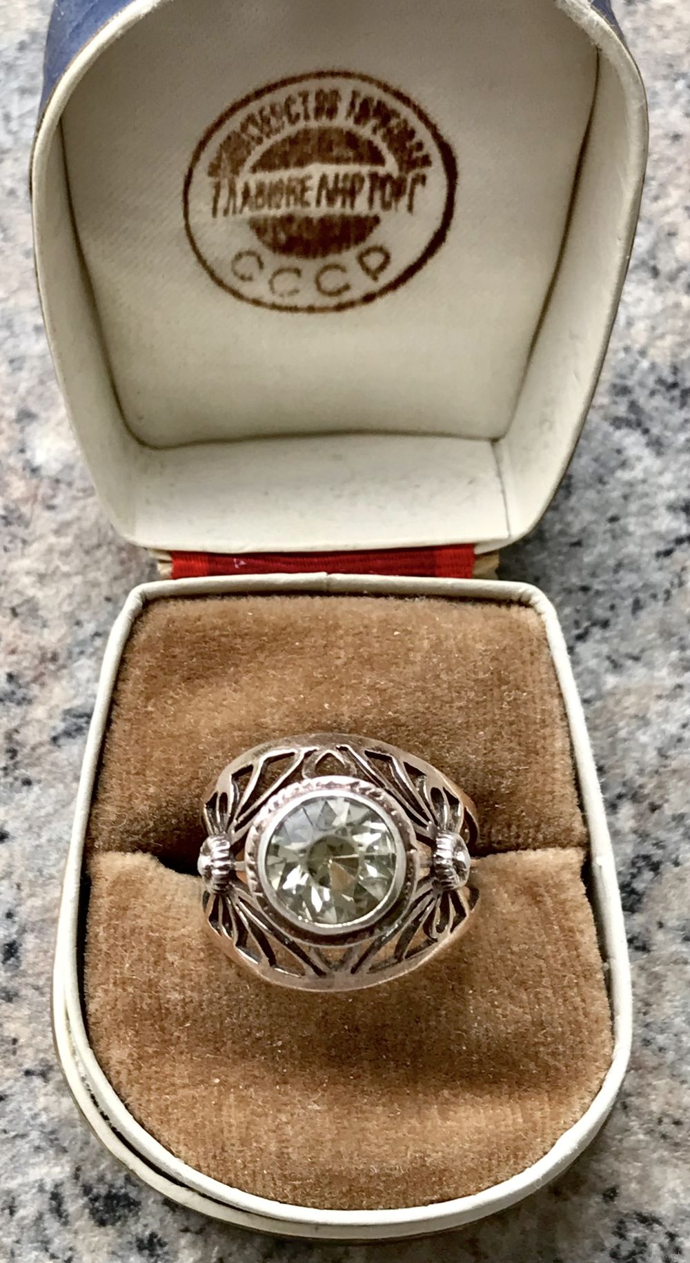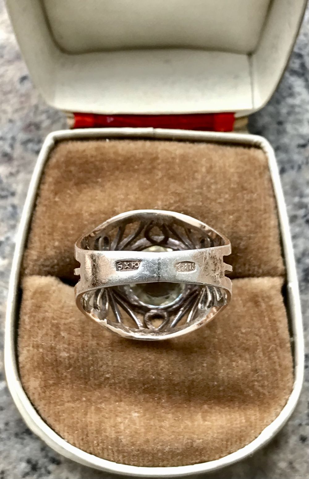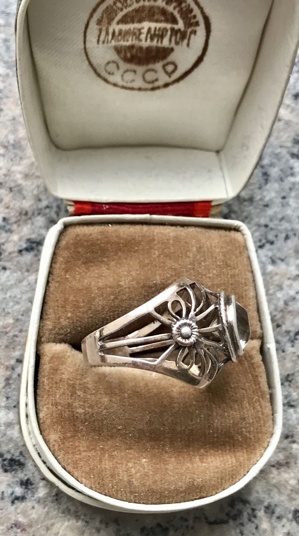 Крупное кольцо из серебра 875пр., изготовлено в 1976г. (именник 6ХЮ) Харьков. Вставка из кварца (имеются небольшие потёртости на гранях, с обратной стороны небольшой скол по центру, эти нюансы учтены в цене). Присутствует лёгкая позолота. Высота лицевой части кольца 1,5см., вставка 0,8см. Размер 17-17,5.
