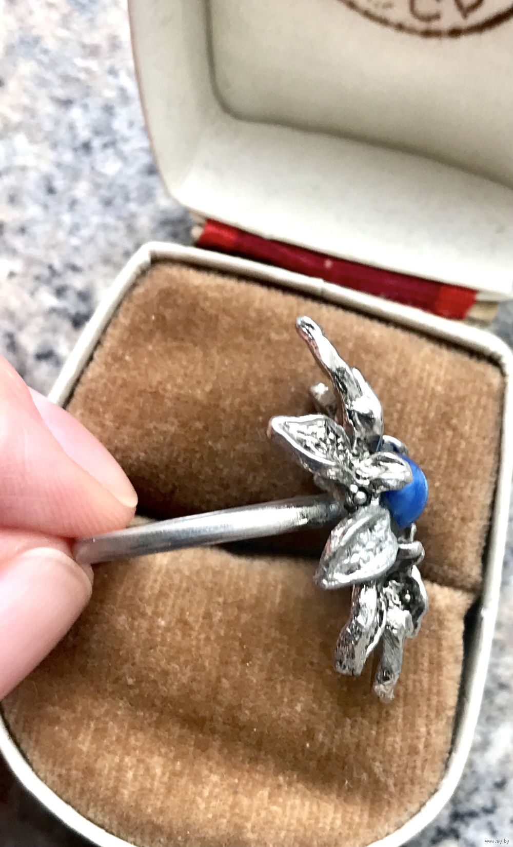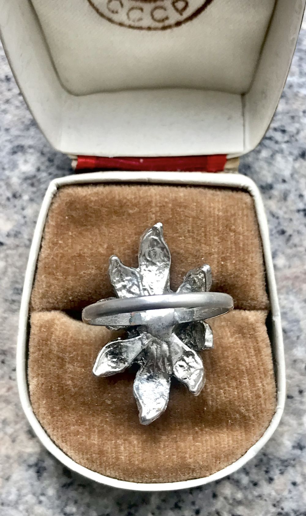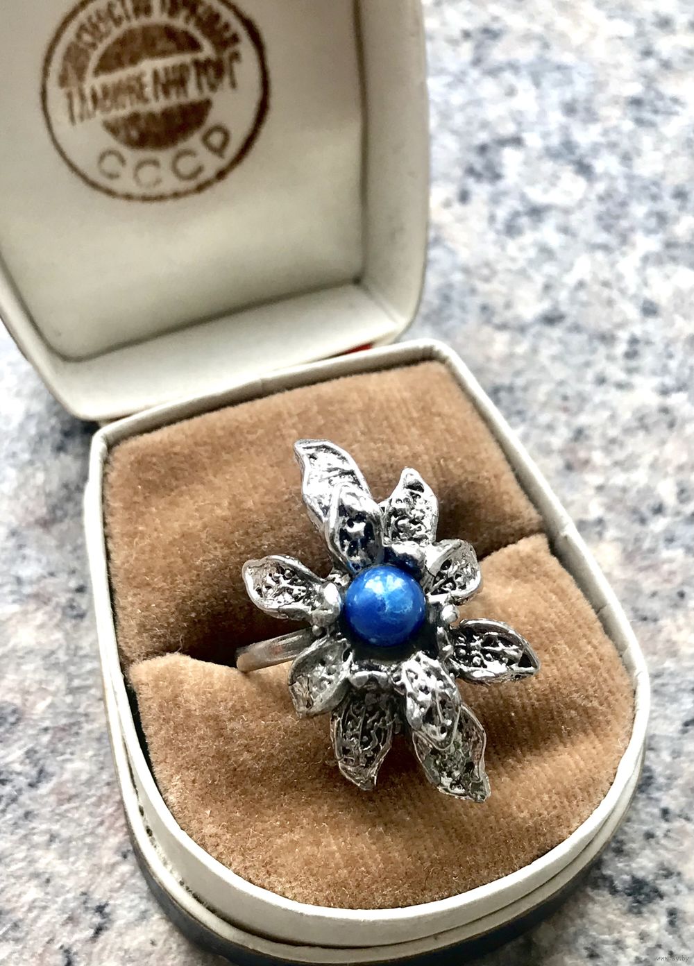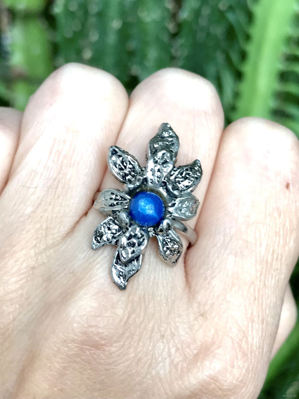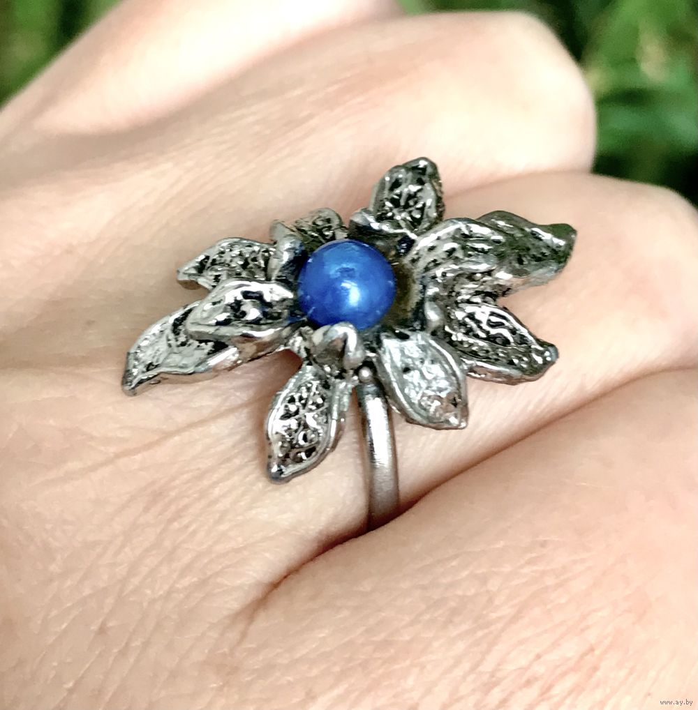 Крупное кольцо с основой из металла с серебрением. Высота лицевой части 3см. На вставке есть небольшой скол (не бросается в глаза). Размер 18-19.